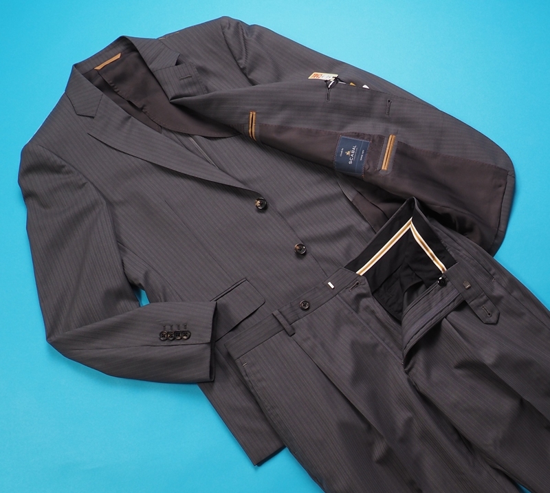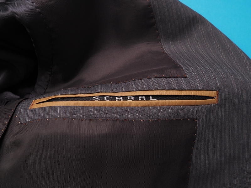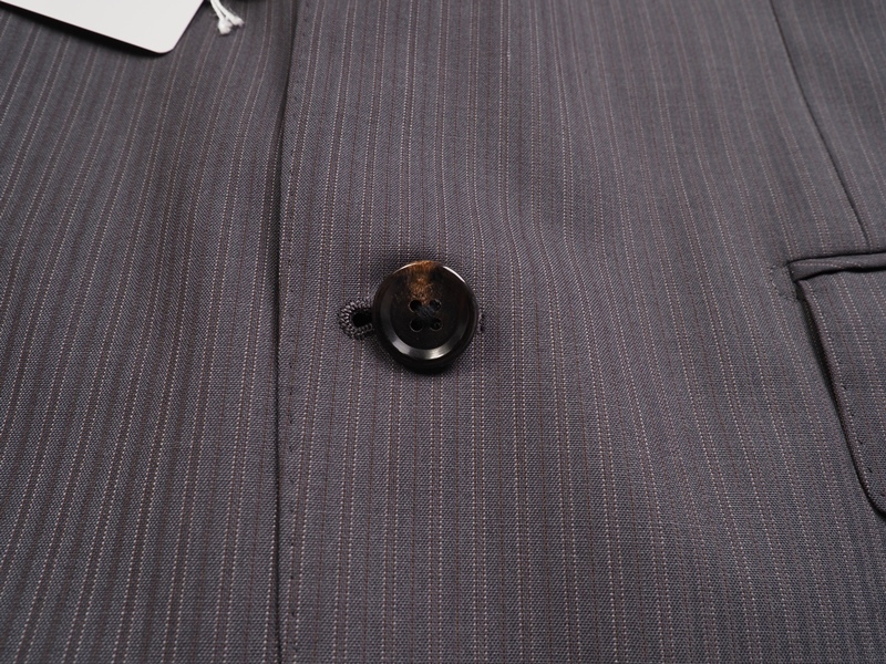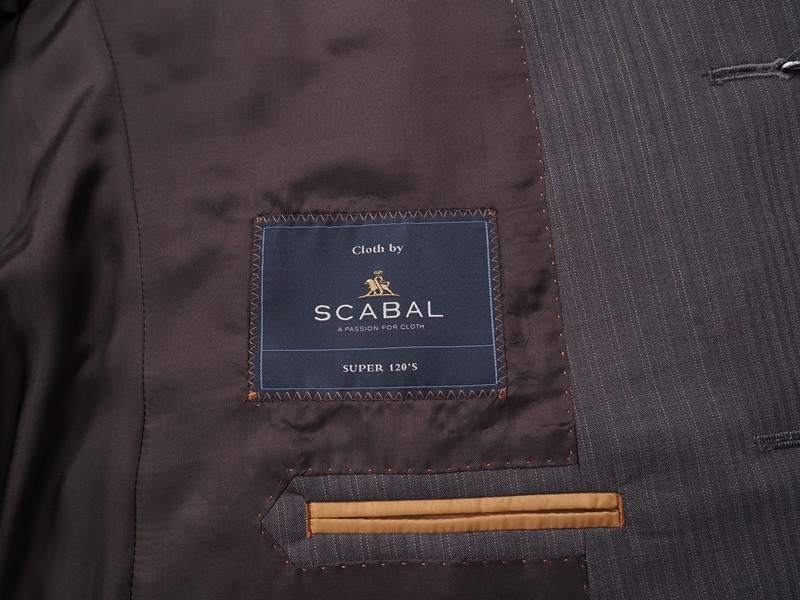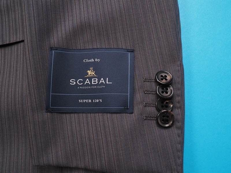 水牛釦、お台場仕立て、AMFステッチ、ラペル毛芯など、百貨店向けならではの上級仕立てで仕上げられております。 ファブリックは英国製生地の中でも最高峰ランクで、「ビンテージ生地の王者」と言われるスキャバル社のSuper120'Sウール100%生地を使用。職人たちの手作業によって、織り上がった生地にペーパープレス仕上げを施すなど、生地の輝きや着心地の良さを高めるための努力を惜しまないことも、ヴィンテージ生地の王者と呼ばれる所以でしす。既製品では無く、オーダーメイドに供される最高級ランクの生地になります。その証として内ポケットに生地タグの耳が用いられています。