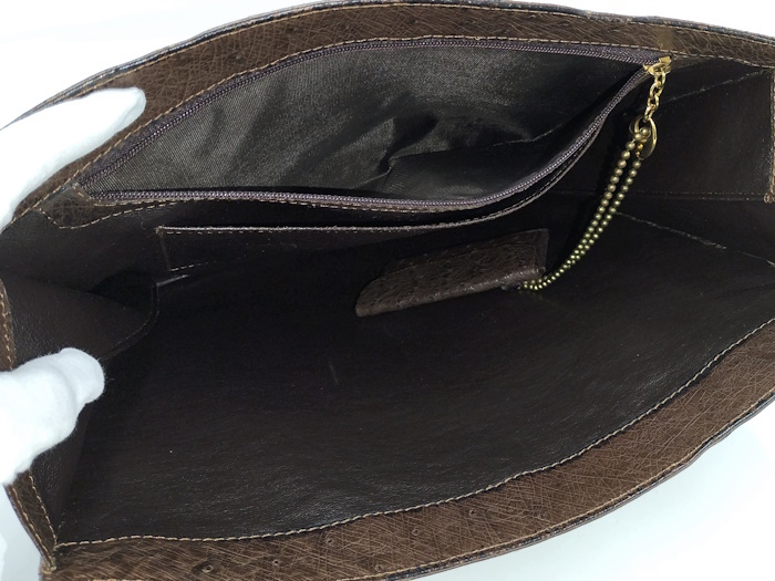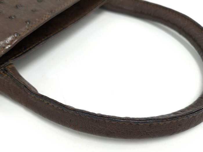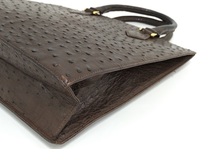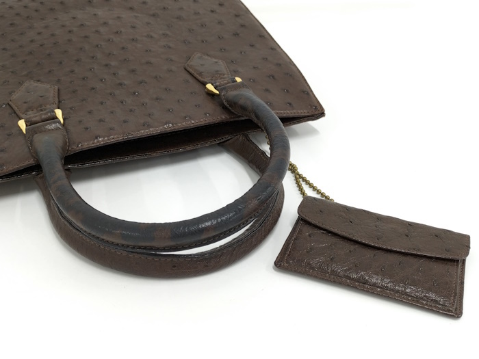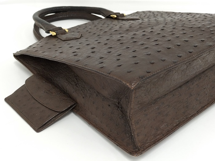 | ◆商品情報 | ・カラー:ブラウン ・素材/ライン:オーストリッチ ・サイズ:最大約 W31×H32×D6(cm) ・ハンドルの長さ:約34(cm) ※多少の誤差はご了承下さい。 ・内側:オープンポケット×1 ファスナーポケット×1 ・外側:ファスナーポケット×1 |