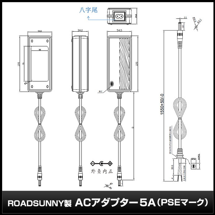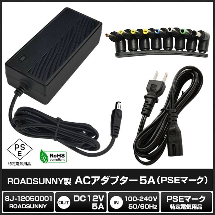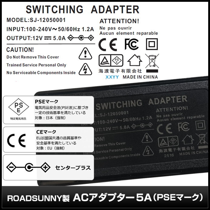 サイズ:約120.0×54.5×34.0mm(奥行/幅/高さ) ケーブル長(出力):約1.5m メガネケーブル長(入力):約1.8m DCジャック外径:5.5mmφ DCジャック内径:2.1mmφ 分類:スイッチングACアダプター 型番:SJ-12050001 出力電圧:12V 出力電流:5A 消費電力:60W メーカー:ROADSUNNY(ロードサニー) 入力端子:差込プラグ 出力端子:DCジャック ジャックタイプ:ストレート 定格入力電圧:AC100~240V 入力周波数:50/60Hz 極性:センタープラス DCコード規格:AWG20/300V/80℃ 重量(本体):約223g パイロットランプ:赤 保証:商品到着後、1年間の品質保証が付いております。 万が一品質に問題があった場合は、メールにてご連絡ください。 | |