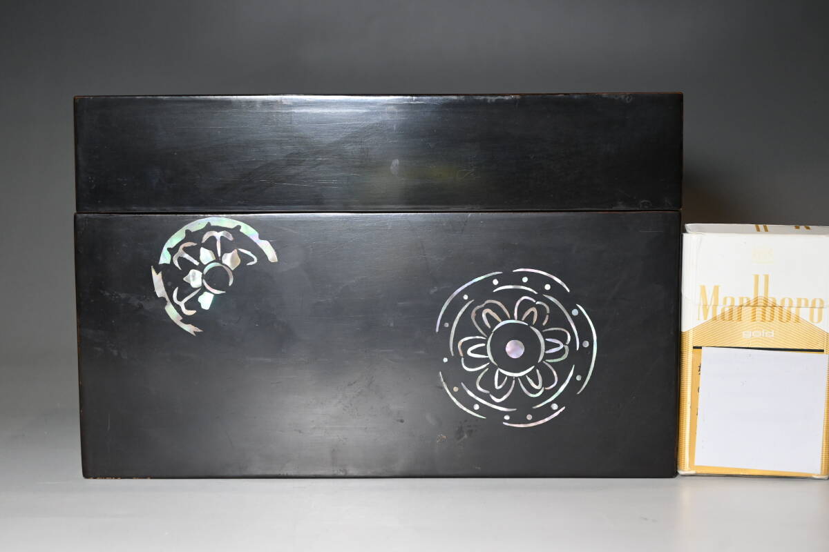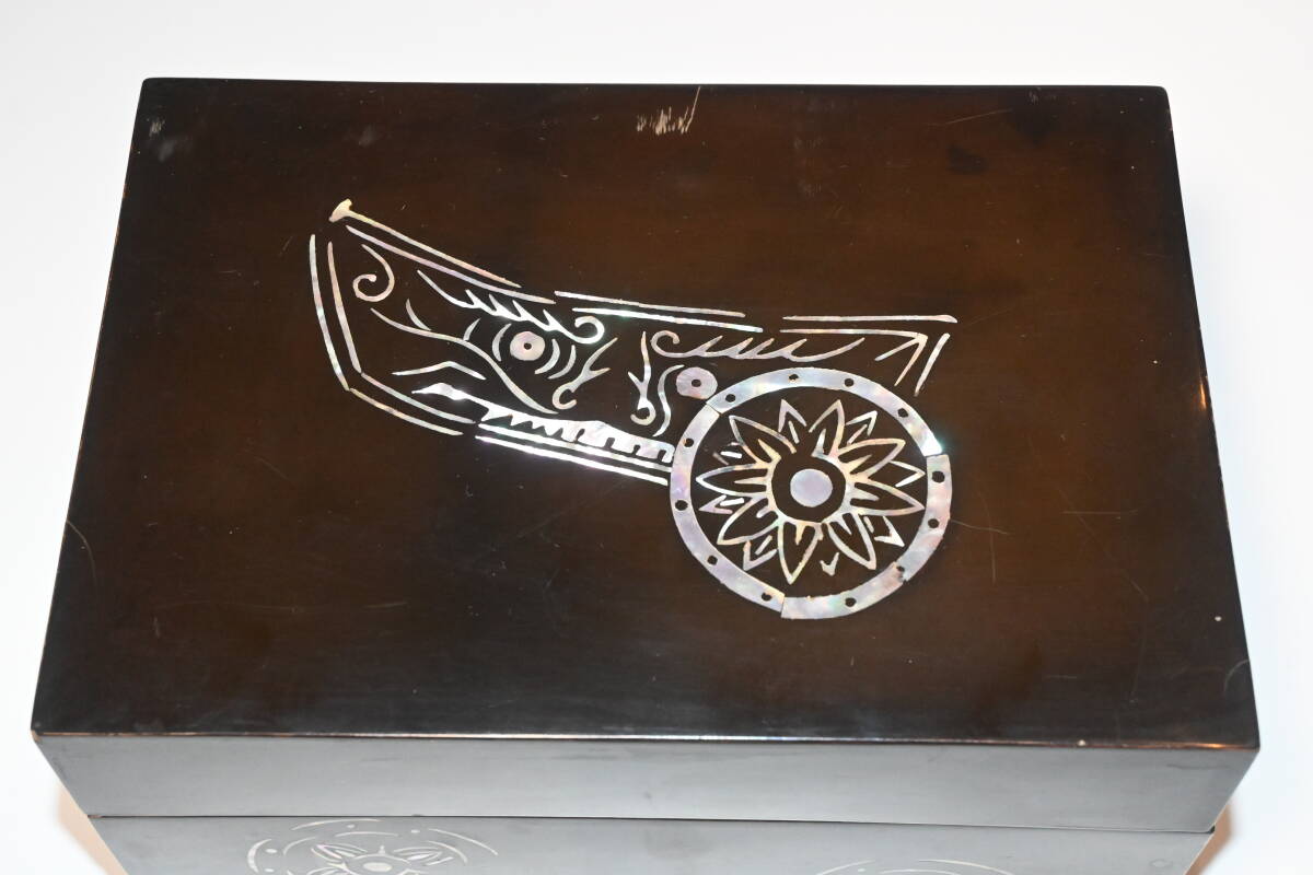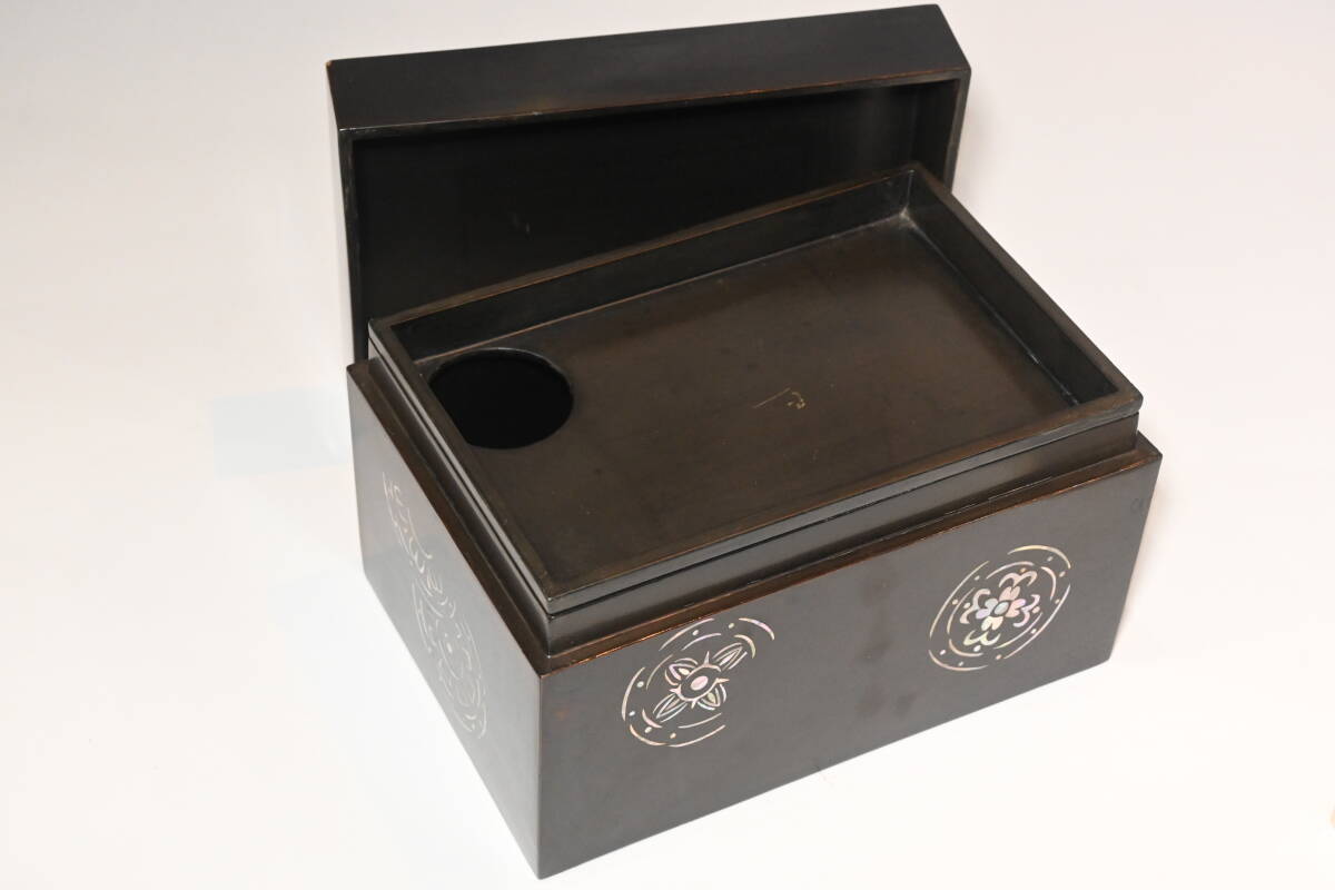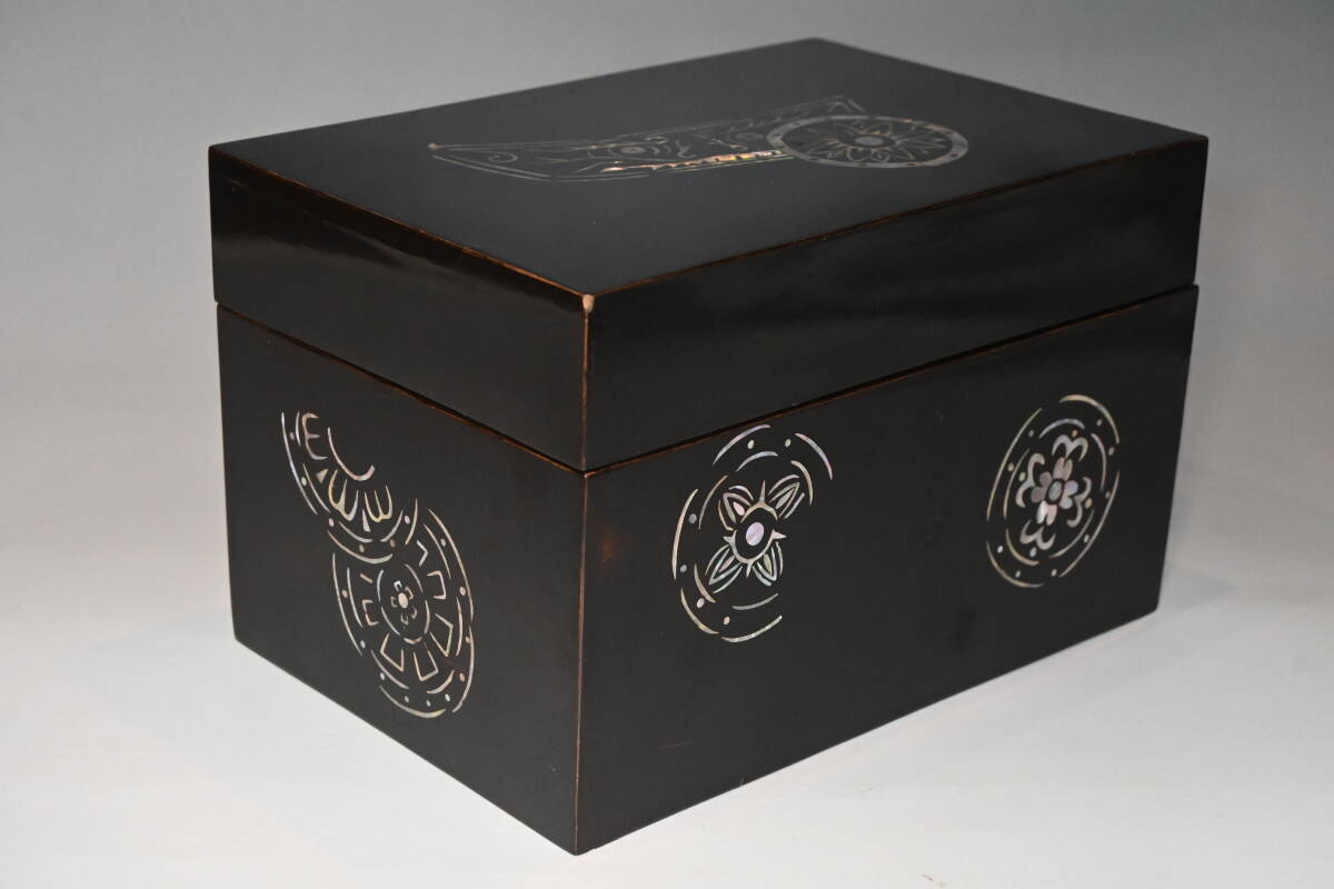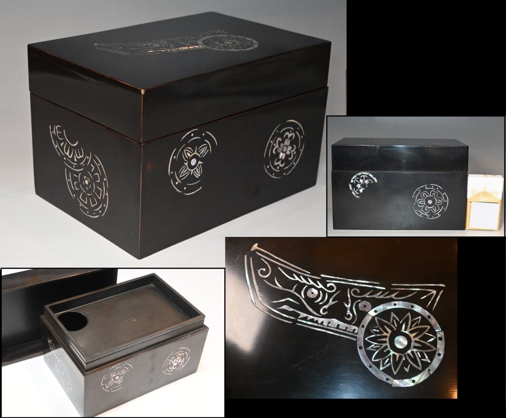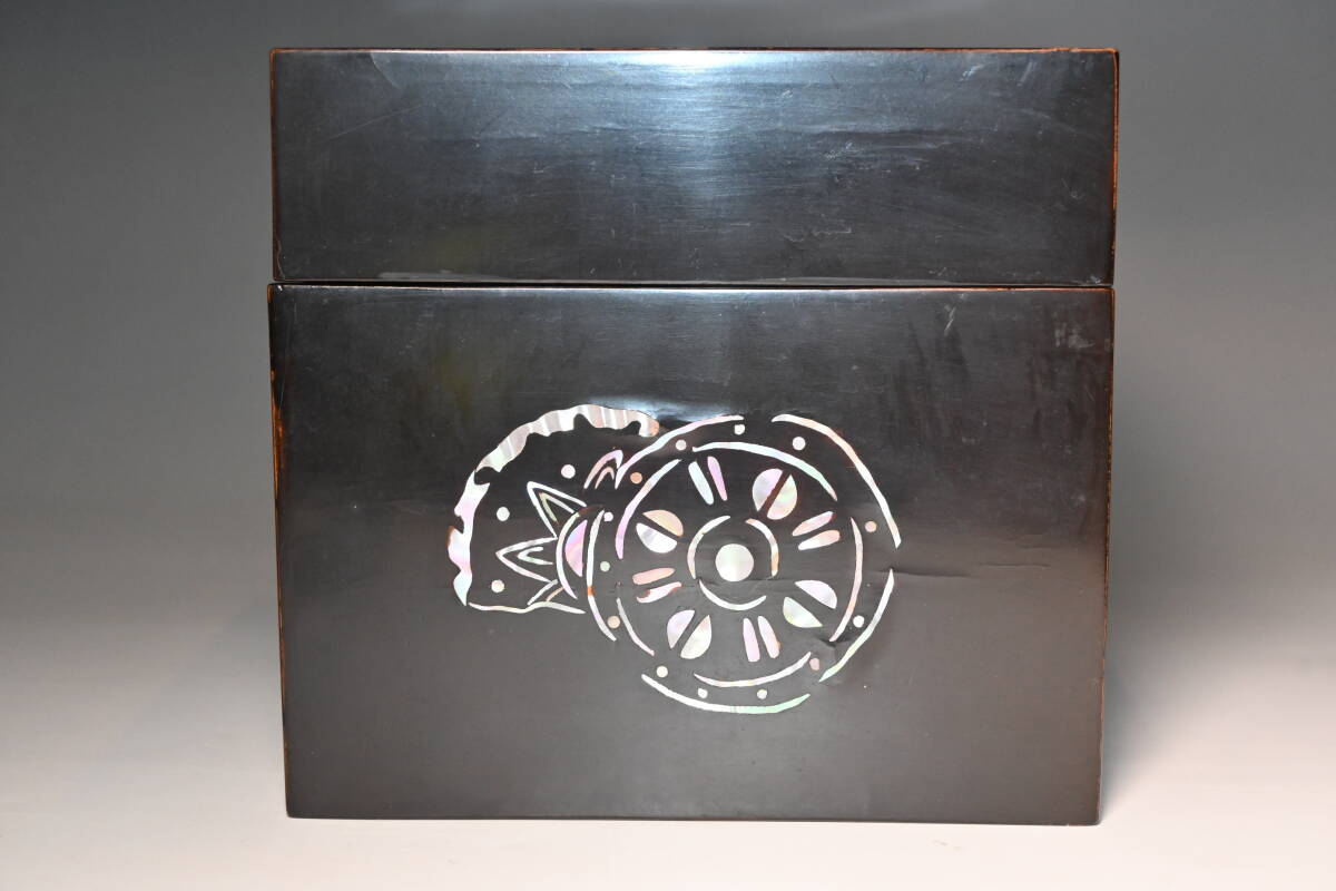 朝鮮美術 螺鈿細工 古瓦文 茶箱 螺鈿茶箱 螺鈿漆器 黒漆螺鈿 茶道具 木製漆器 漆芸 蓋物 茶具 四方箱 | |||