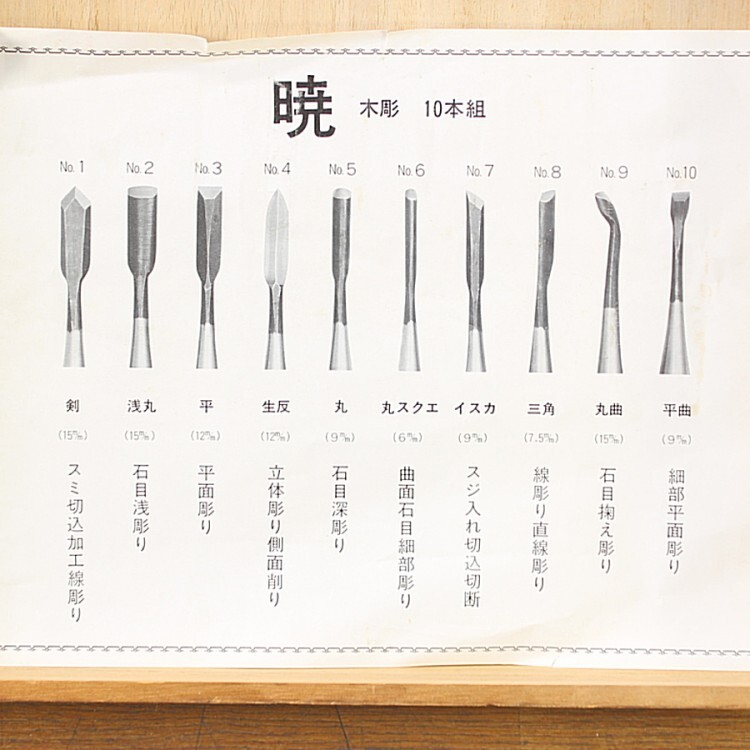 | 管理番号:1100000102249 メーカー:河清刃物 規格・仕様: No.1:剣 15mm スミ切込加工線彫り No.2:浅丸 15mm 石目浅彫り No.3:平 12mm 平面彫り No.4:生反 12mm 立体彫り側面削り No.5:丸 9mm 石目深彫り No.6:丸スクエ 6mm 曲面石目細部彫り No.7:イスカ 9mm スジ入れ切込切断 No.8:三角 7.5mm 線彫り直線彫り No.9:丸曲 15mm 石目掬え彫り No.10:平曲 9mm 細部平面彫り 詳細備考: 丸、浅丸に刃こぼれあります。 若干のサビがあります。 状態は画像でご確認下さい。 商品は写真に写っているもので全てです。(※背景などにある無関係の物は含まず) 他に付属品はありません。 ご質問はお気軽にどうぞ。分かる範囲でお答えします!! ※上記は型番などから調べたデータを抜粋したものです。 |