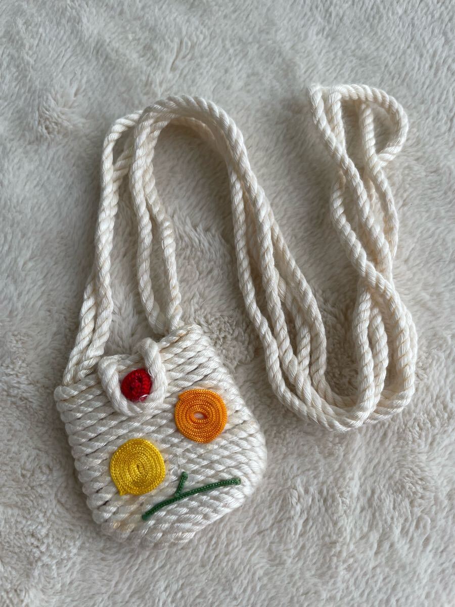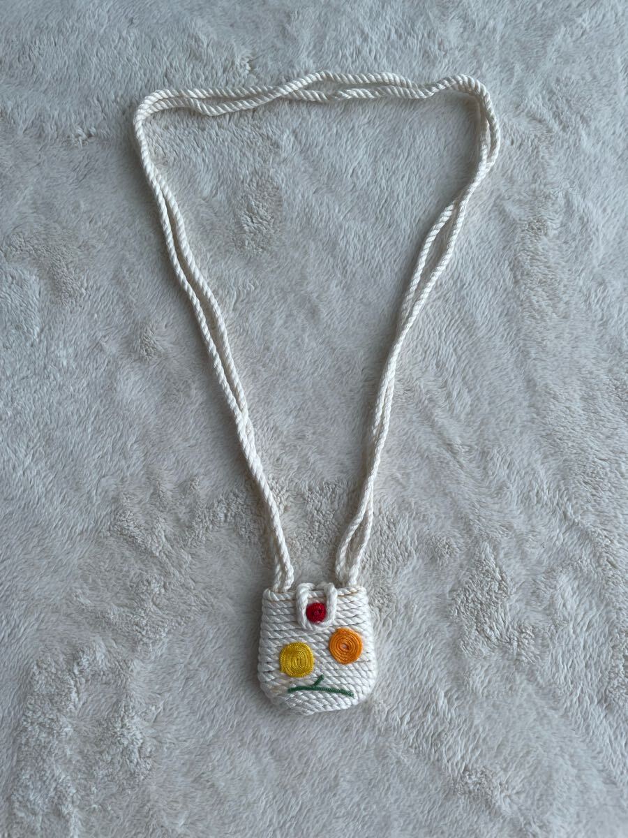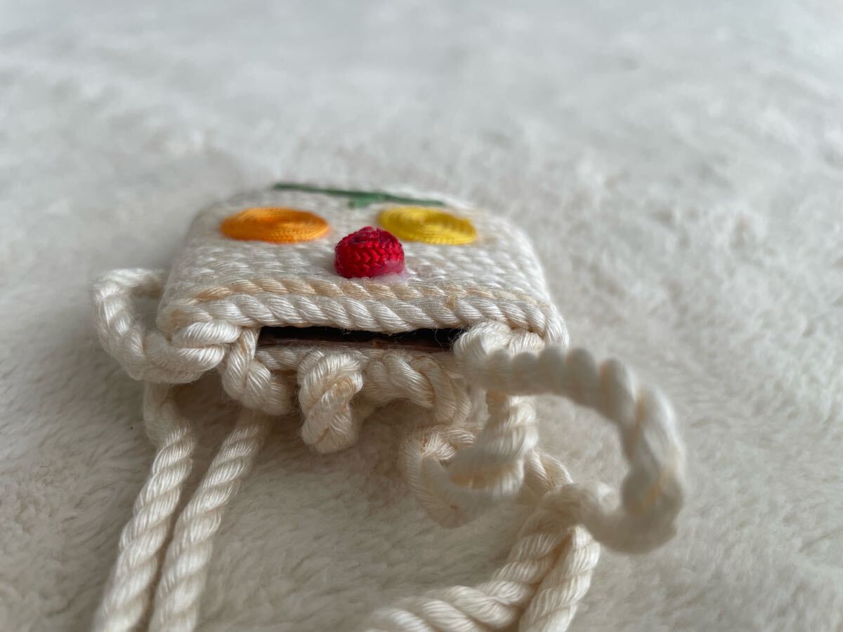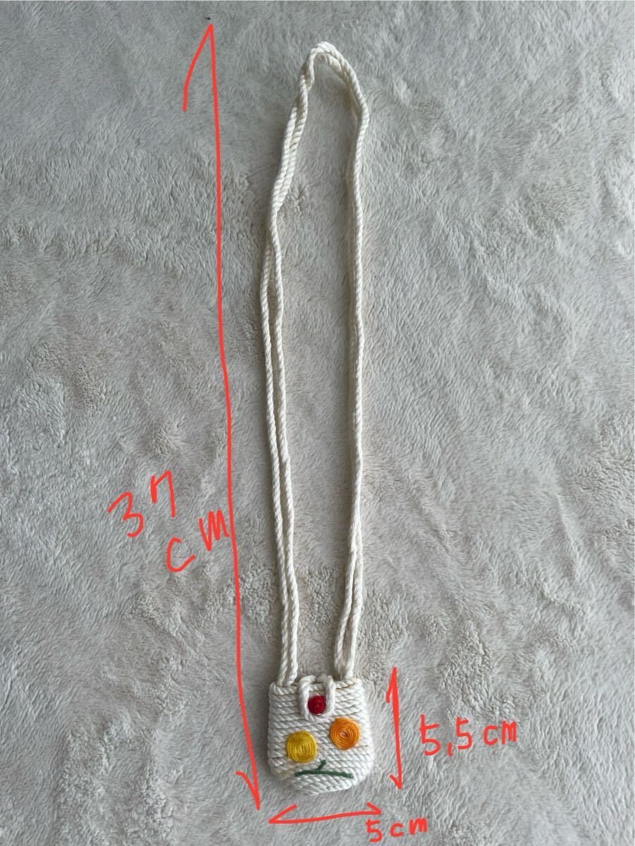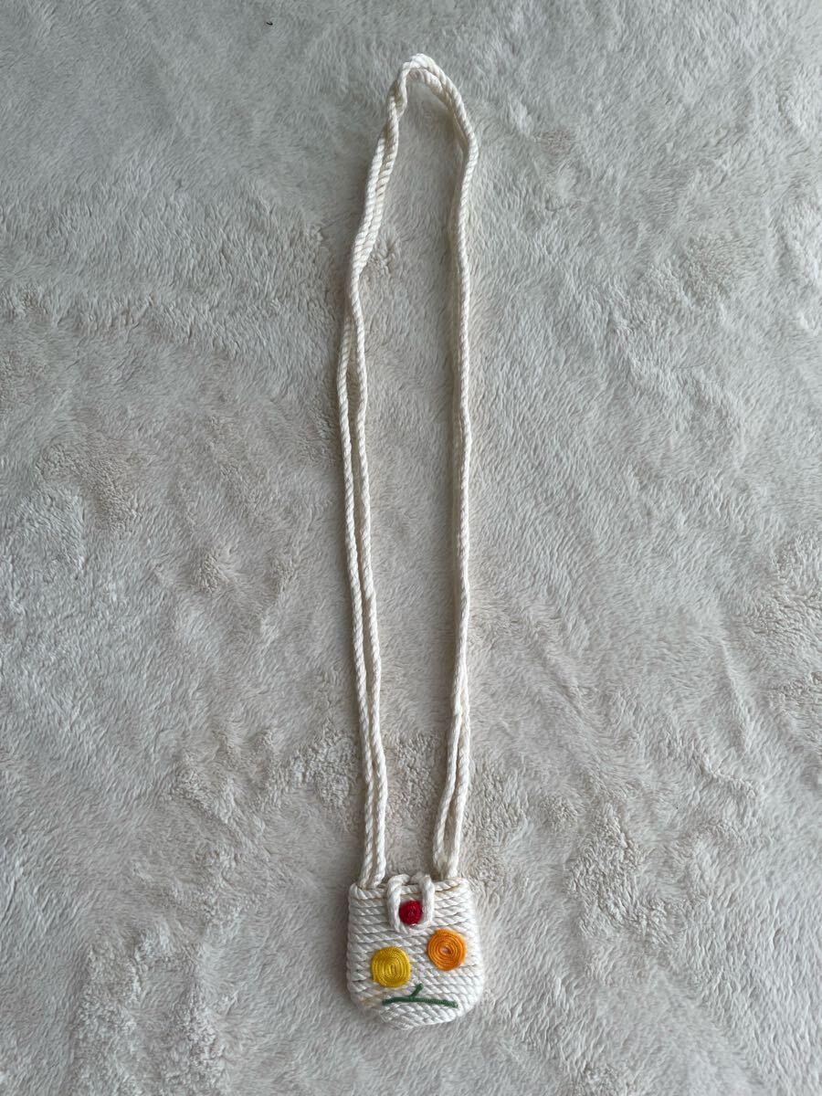 しっかりした紐で編まれており、中央には花柄のようなモチーフがついていて、ポケット状になっています