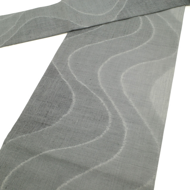 本場結城紬 名古屋帯 未使用 正絹 九寸 グレー なみなみとした 曲線柄 モダン 結城紬 カジュアル 新古品 仕立て上がり みやがわ sbs54004
