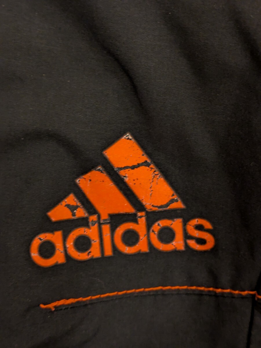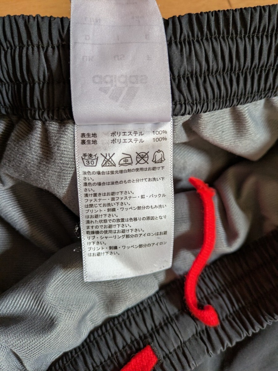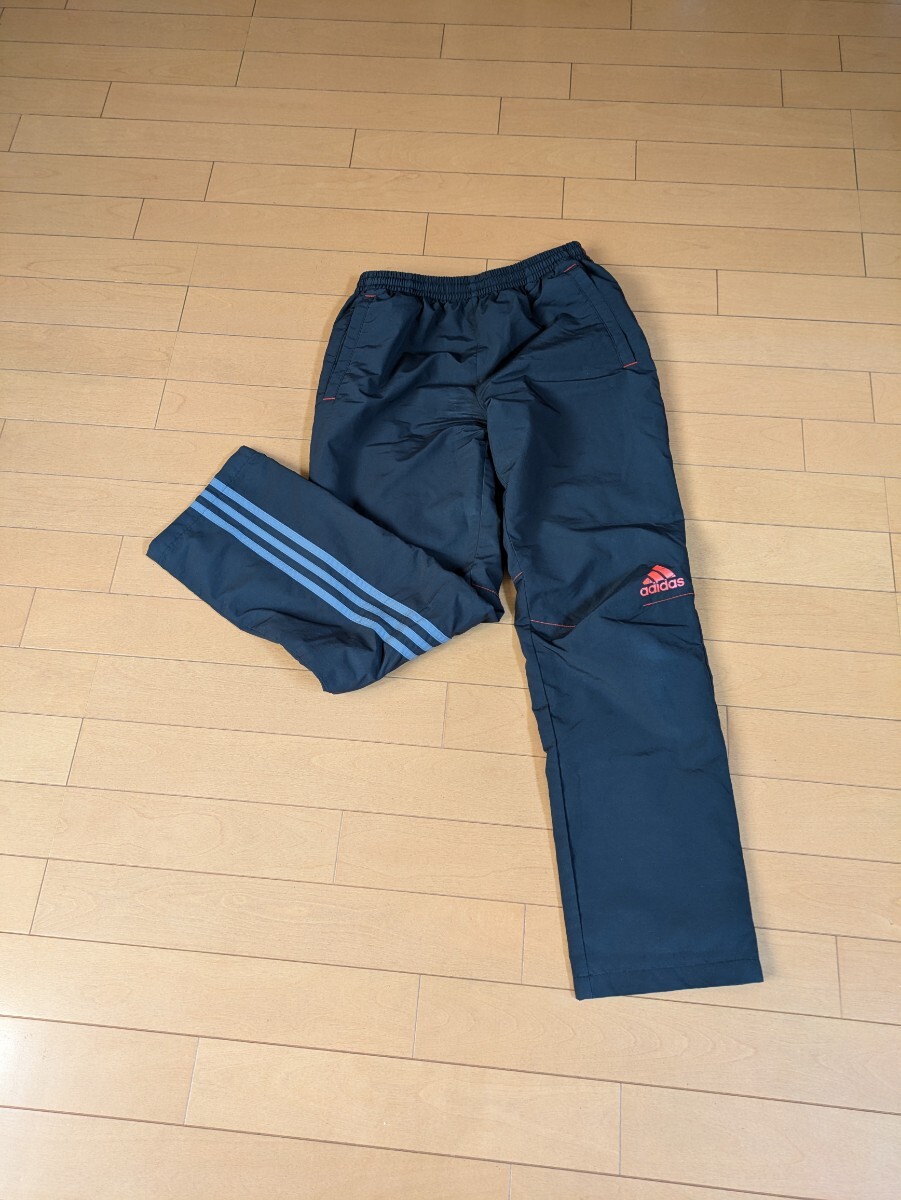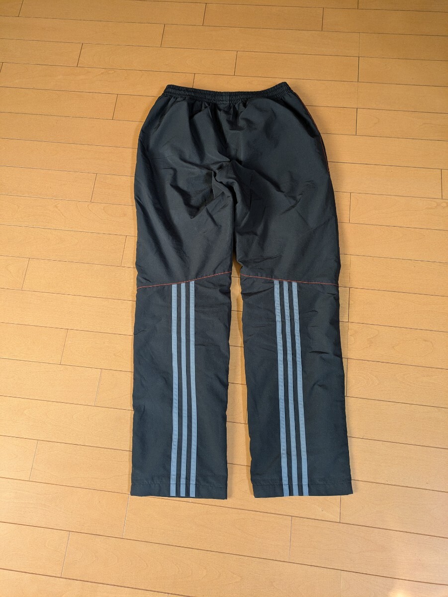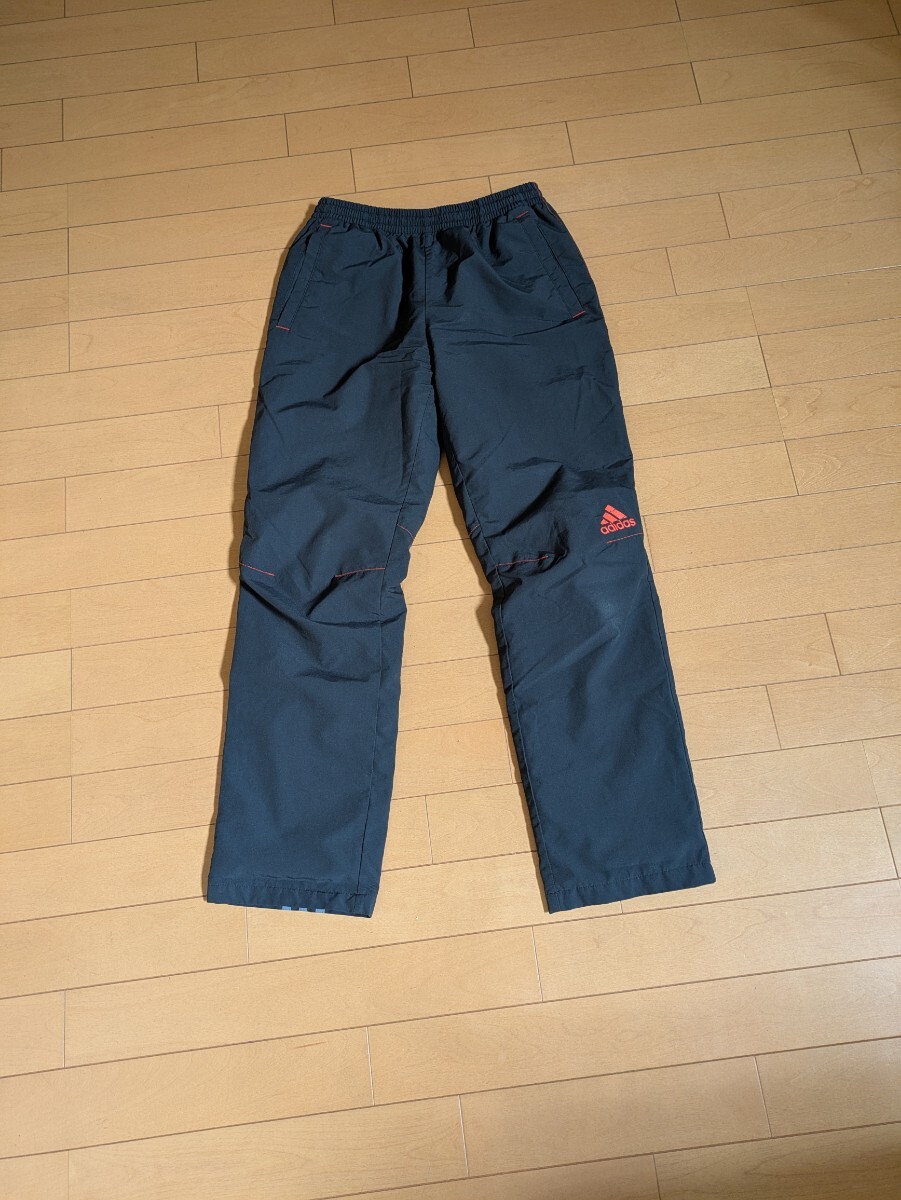 adidasのダークグレーのストレートパンツ、サイドポケット付きで機能的。