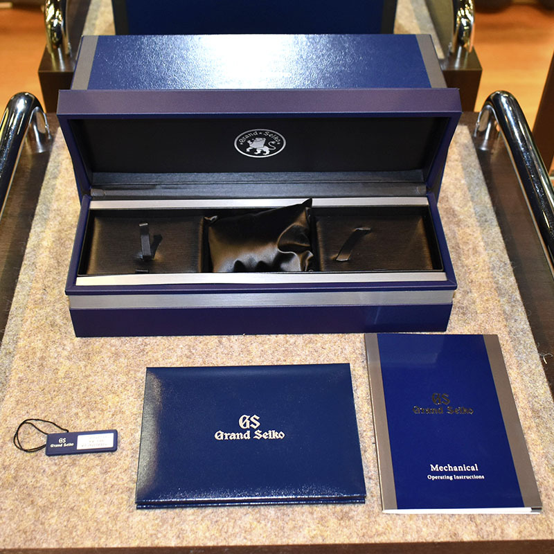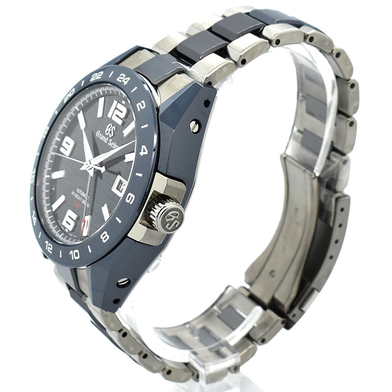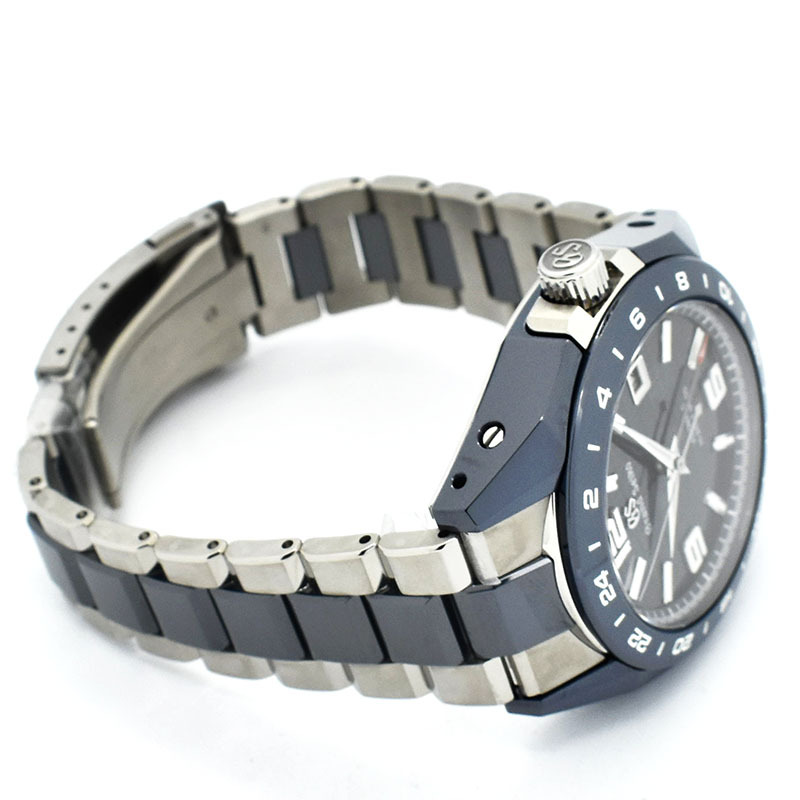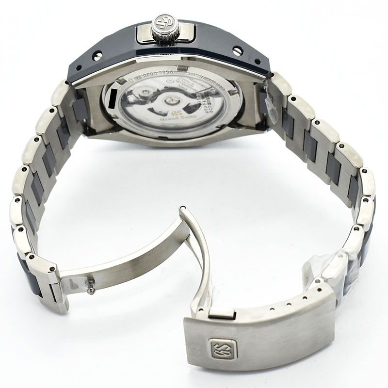 | 店長メモ | セラミックという素材の特性上難しいとされていた"グランドセイコーブルー"の色調を再現し、奥深い輝きを放つ個性的な仕上がりです。 ブレスレットを側面から見て頂くと、わずかにセラミックがチタンより厚いのがお分かりいただけます。 これはセラミックの方が傷に強いという特性を活かしチタンを守る為の構造です。 こういった細やかな配慮を施すあたりにグランドセイコーらしさを感じさせられる1本です。/100m防水 |