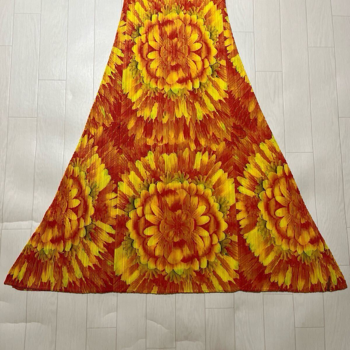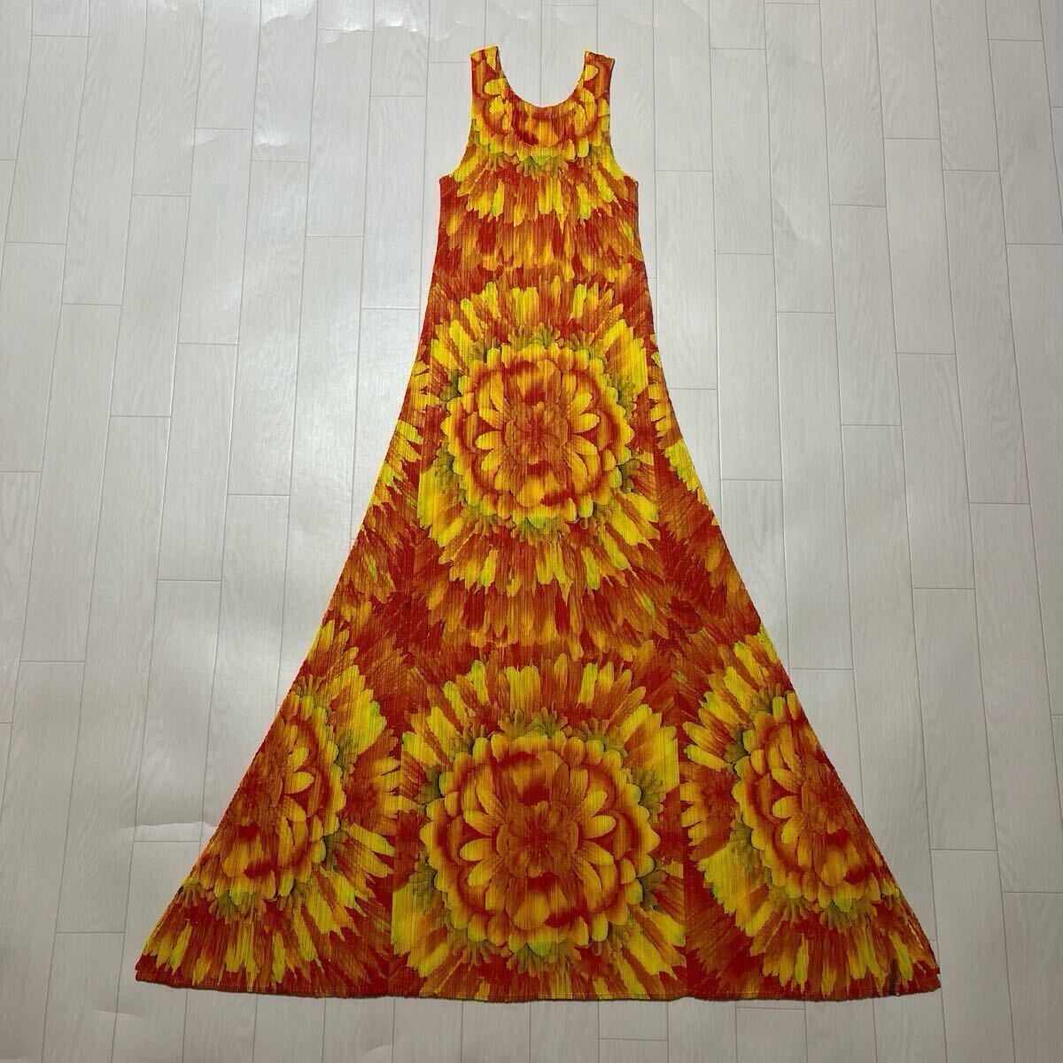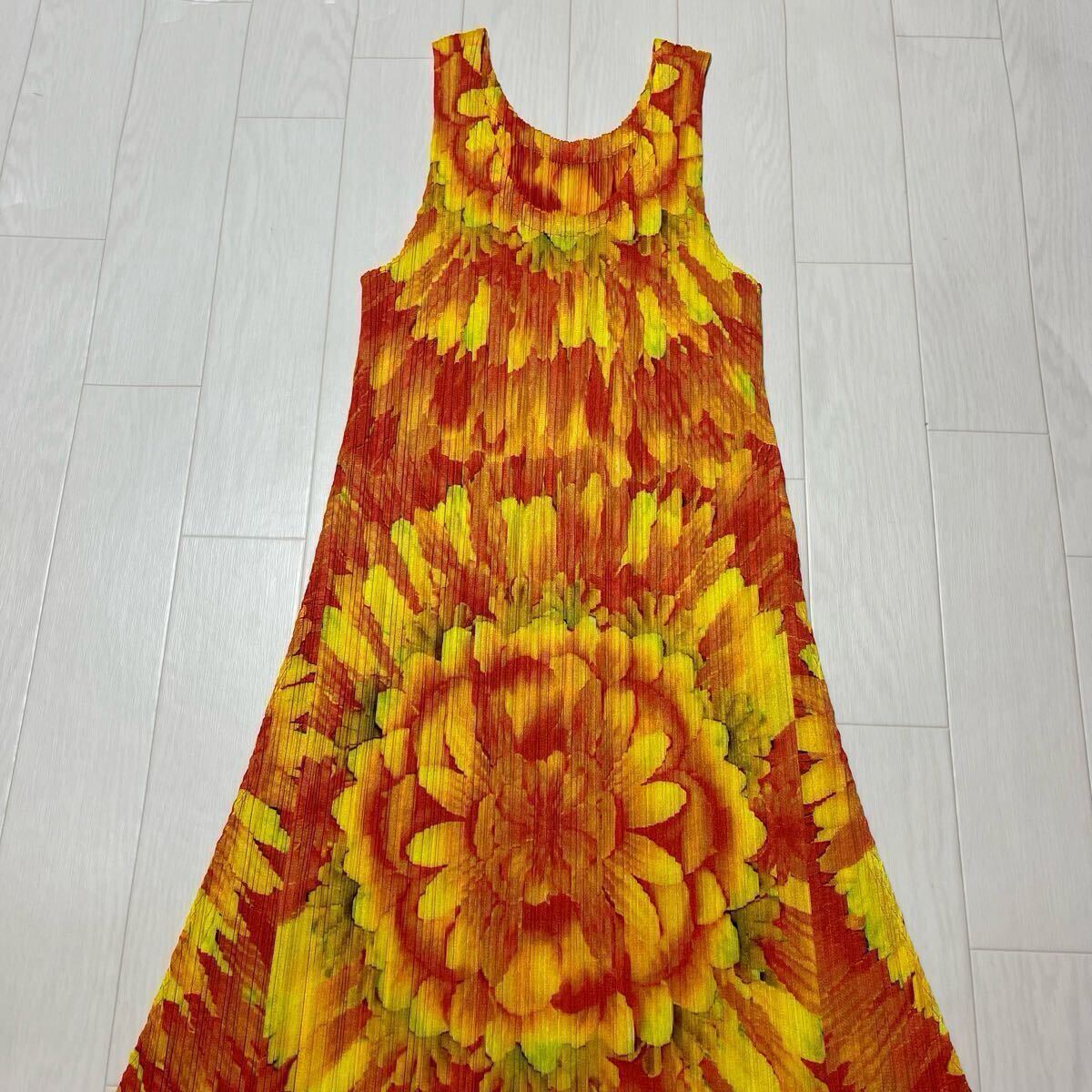 美品 プリーツプリーズ イッセイミヤケ ダリア フレア ノースリーブ ロングワンピース 花柄 ひまわり 向日葵 フラワー