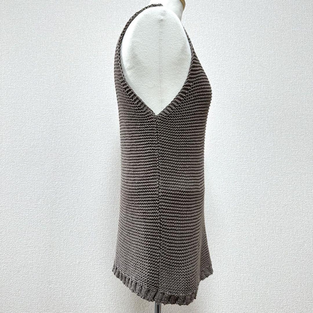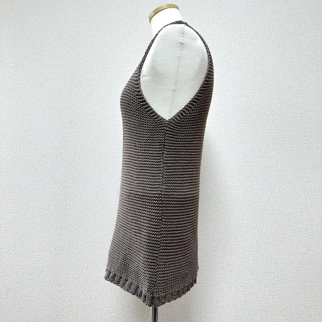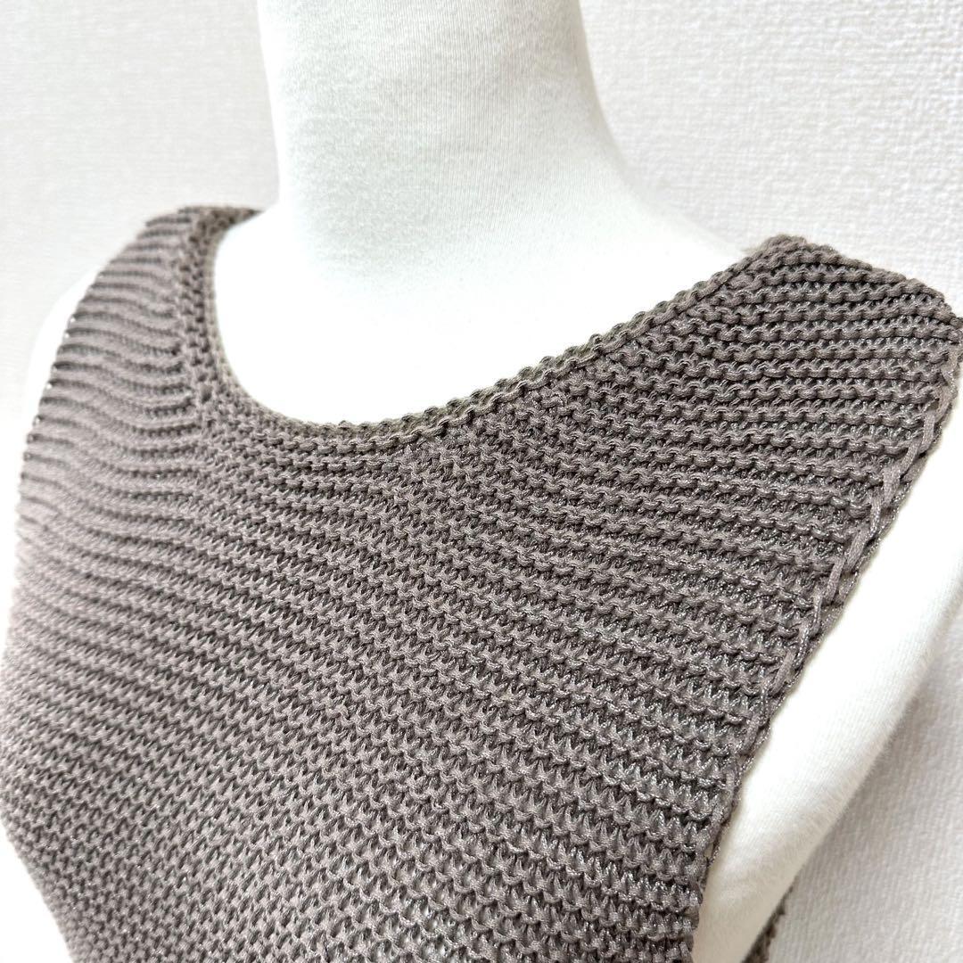 ブラウンのニットノースリーブ、タイトフィットデザインでスタイリッシュ。