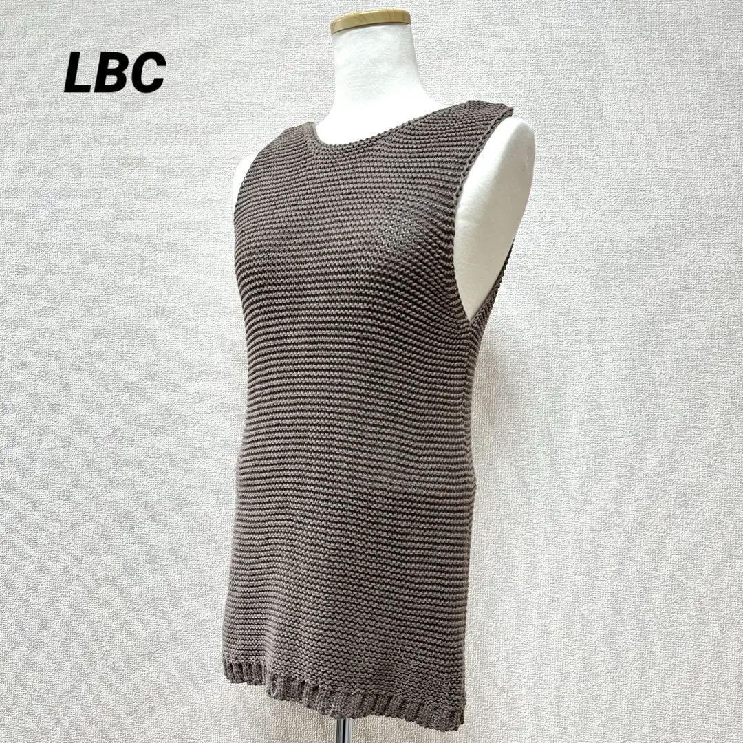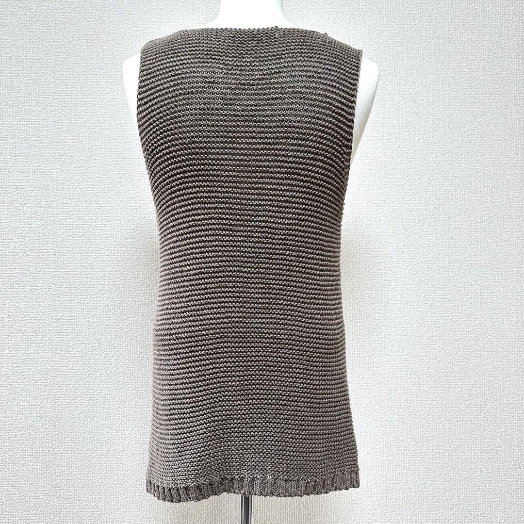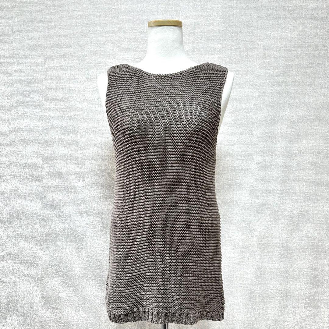ブラウンのニットノースリーブ、タイトフィットデザインでスタイリッシュ。
