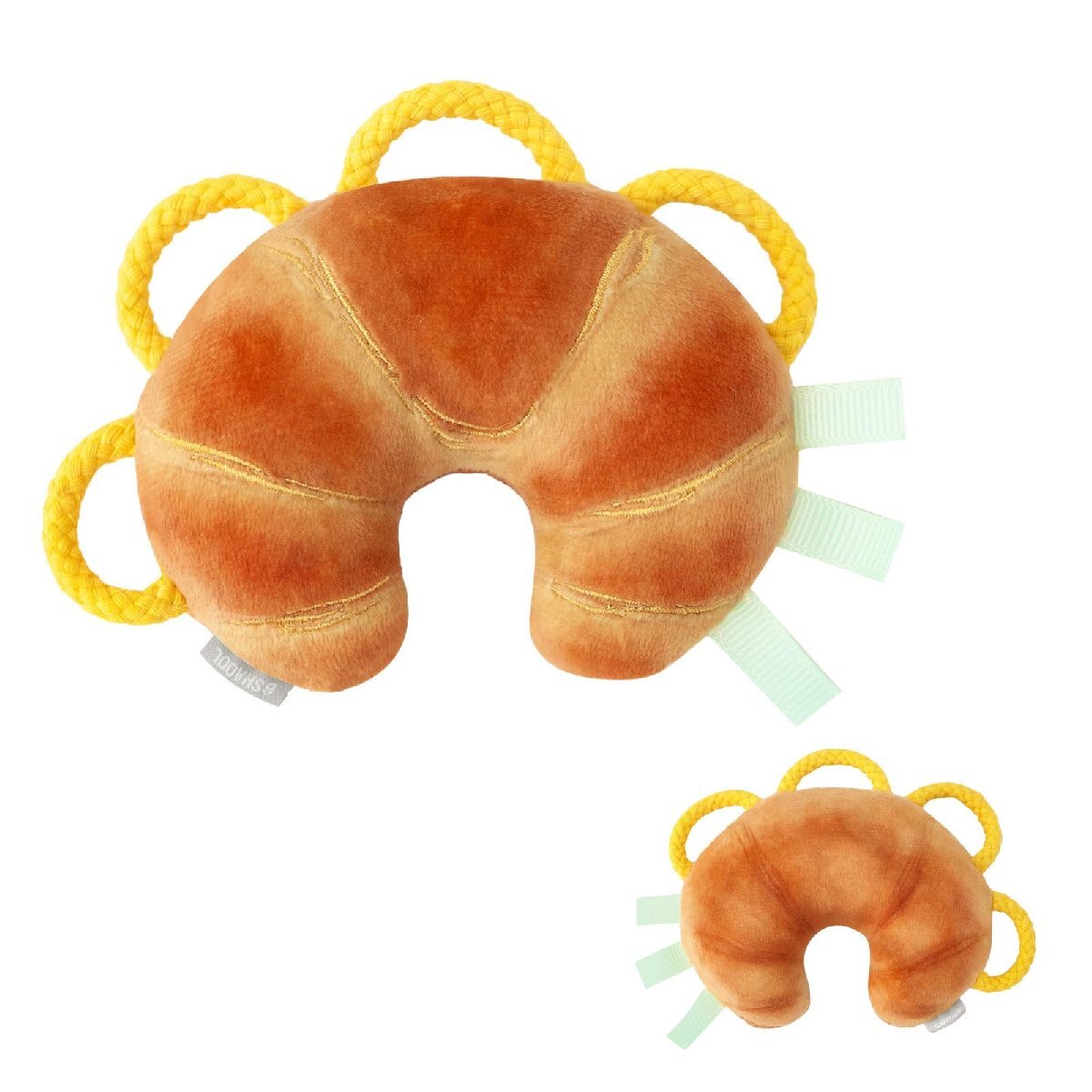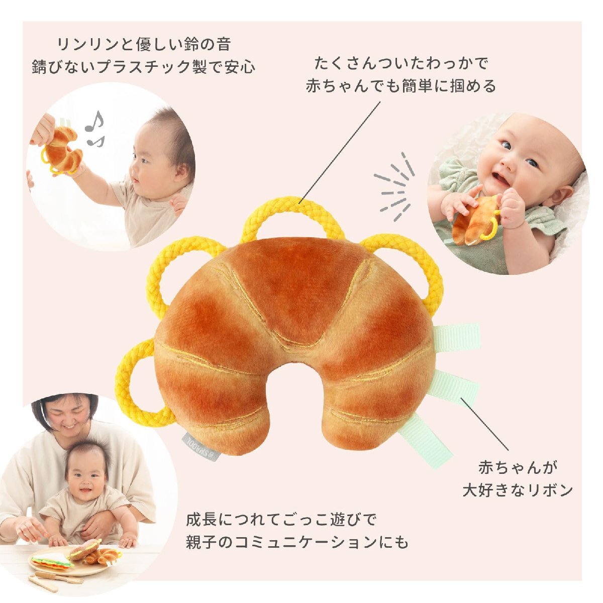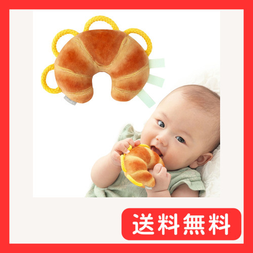 「シャオール 鈴付き わっかラトル (クロワッサン / 0歳 ベビー) 赤ちゃん 新生児 知育玩具 ファーストトイ おもちゃ プレゼント ギフト」▼4571448110508▼(商品説明)・ブラウン ・・PatternName:クロワッサン・??【本物そっくりなおもちゃ】本物そっくりでおいしそうなクロワッサンのかたちのラトル。持って遊ぶ赤ちゃんもまわりの大人も、みんなを笑顔にする楽しいデザインです(両面で色違い)。少し大きくなったら「ちょうだい」「どうぞ」のやりとりや、おままごとなどのごっこ遊びも楽しめます。・??【赤ちゃんの発達に寄り添う】小さな子どもの手でも掴みやすいわっかは、指に引っ掛けて偶然持つことから始まり、発育に合わせて、意図してつかむ・振る・離すというように動作も変化していきます。早い段階から指先の感覚を刺激することで、赤ちゃんの発達・成長を促します。・??【振る・聞く・触る】振るとリンリンと優しい鈴の音がして、音を認識する力を育み、親や玩具に興味を持つきっかけに。ひらひらしたリボンは赤ちゃんの大好きなタグにそっくり。舐めたり引っ張ったり、好奇心を刺激します。出産祝いや誕生日、クリスマスのプレゼントにもおすすめの知育玩具です。・??【洗えるから清潔に遊べる】中に入っている鈴は錆びないプラスチック製を使用しており、洗濯できます。周囲につ