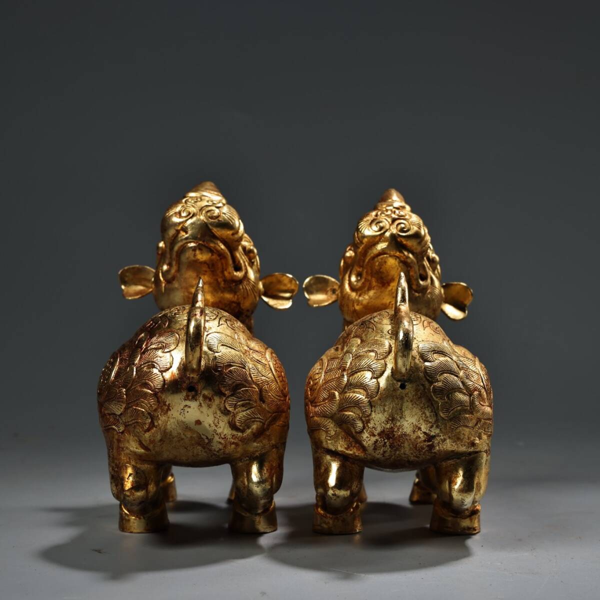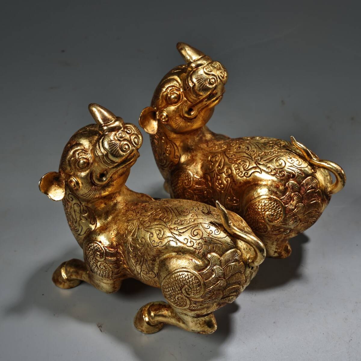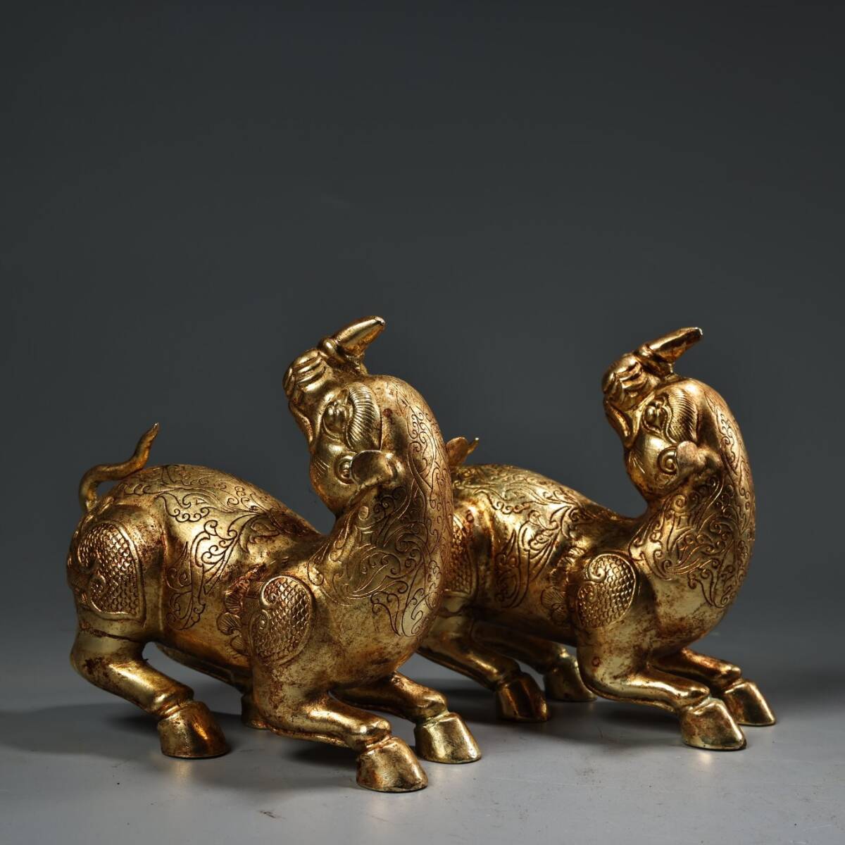 【超珍館蔵】銅製 塗金 回頭獣一對 置物 賞物 古賞物 古董品 古美術品 時代物 旧家蔵出 稀少珍蔵品