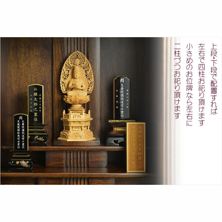 掲載写真の位牌、仏像、仏具セット、おリン等は別売、造花は非売品です