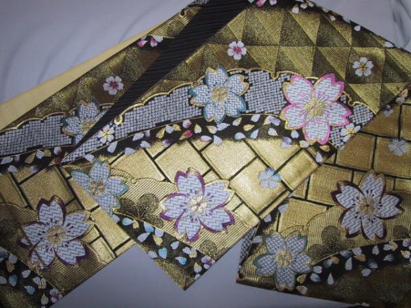 なお、帯柄左上に無地で出ているところは裏無地で、柄と柄の間に出ているところは手先と前太鼓のあいだの無地部分です。六通柄です。金銀糸が多用されているためストロボの照りで、しろぽく写っている部分があります
