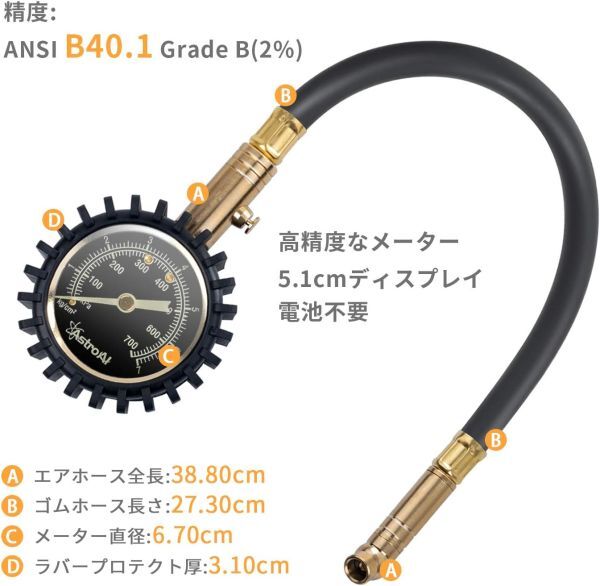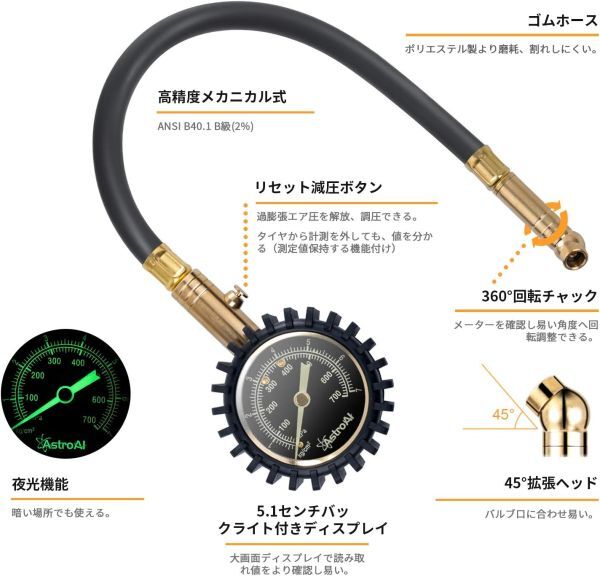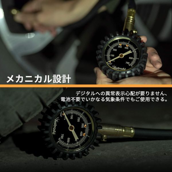 AstroAI エアゲージ タイヤゲージ 700KPA  空気圧計 自発光機能 トラック 自動車 バイク 自転車に対応(ホース付き型) 新品未使用品になります。
