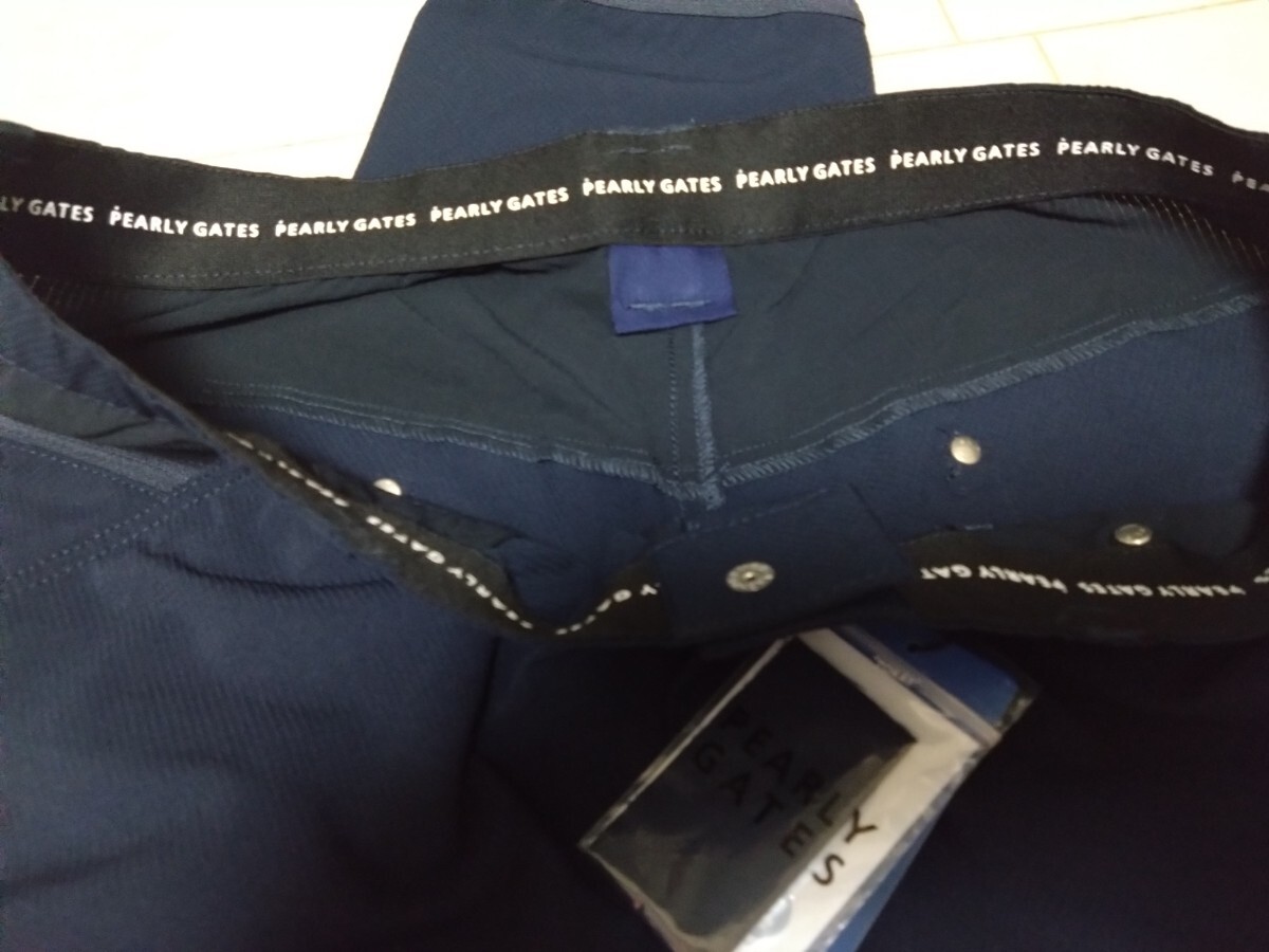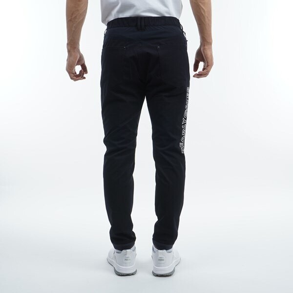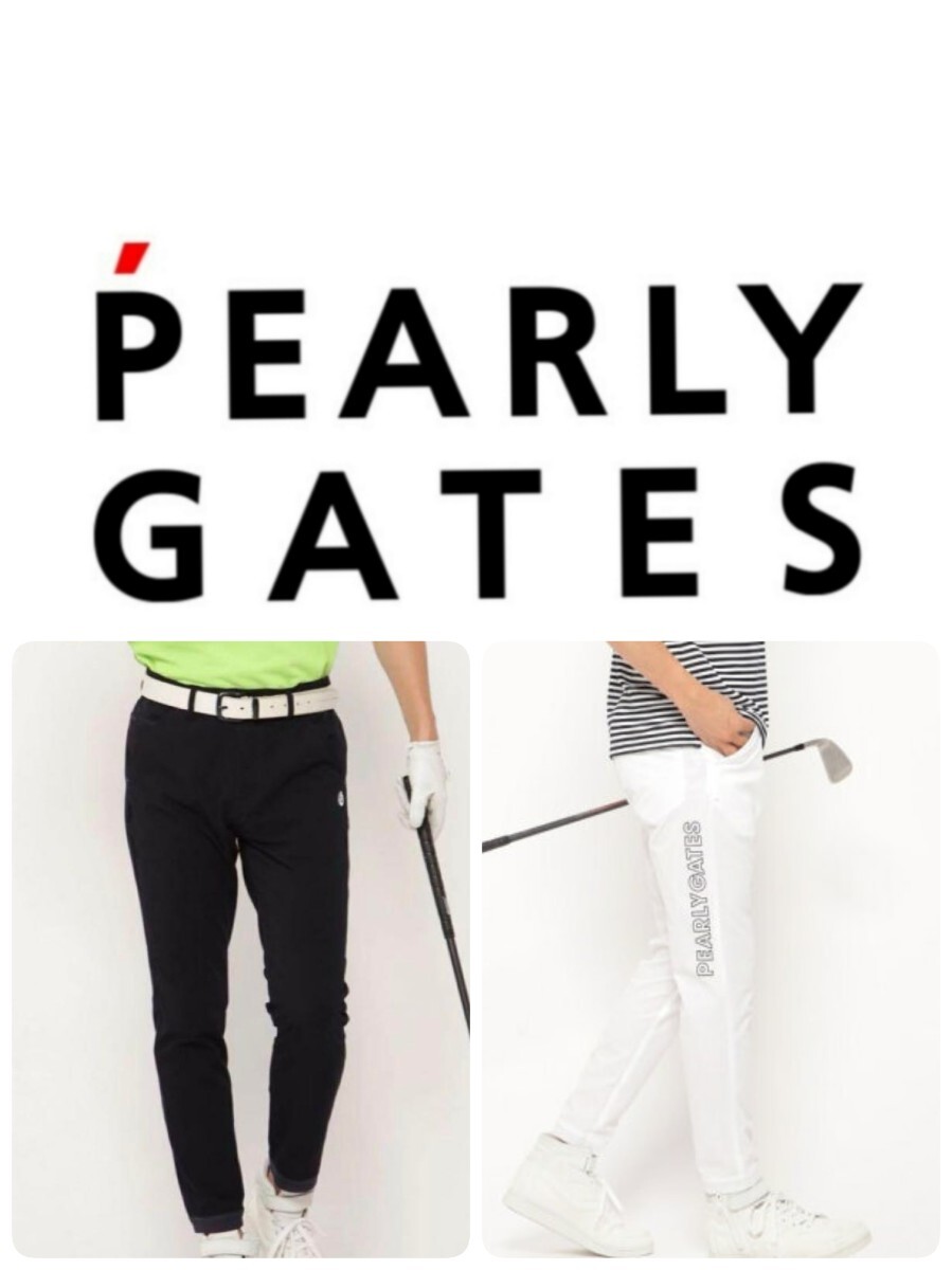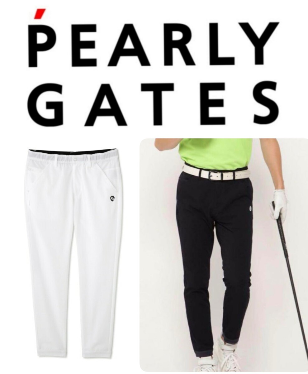 ホワイトで縁取ったアウトラインの縦ロゴ PEARLY GATESプリントのストレッチダイヤドビー×ドットエアージョガーパンツ