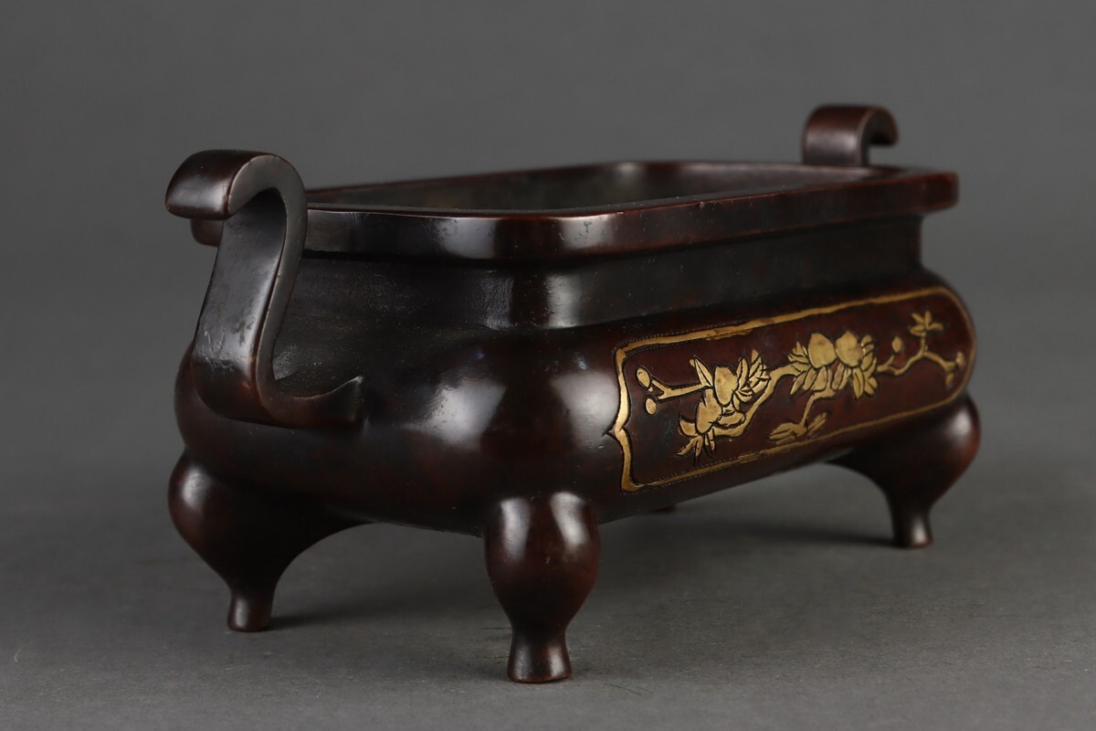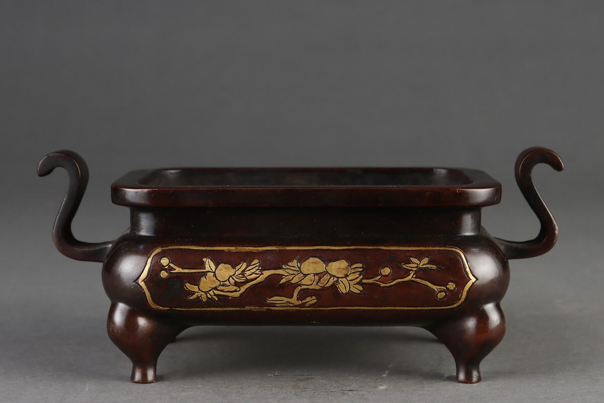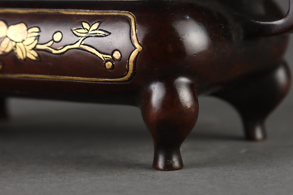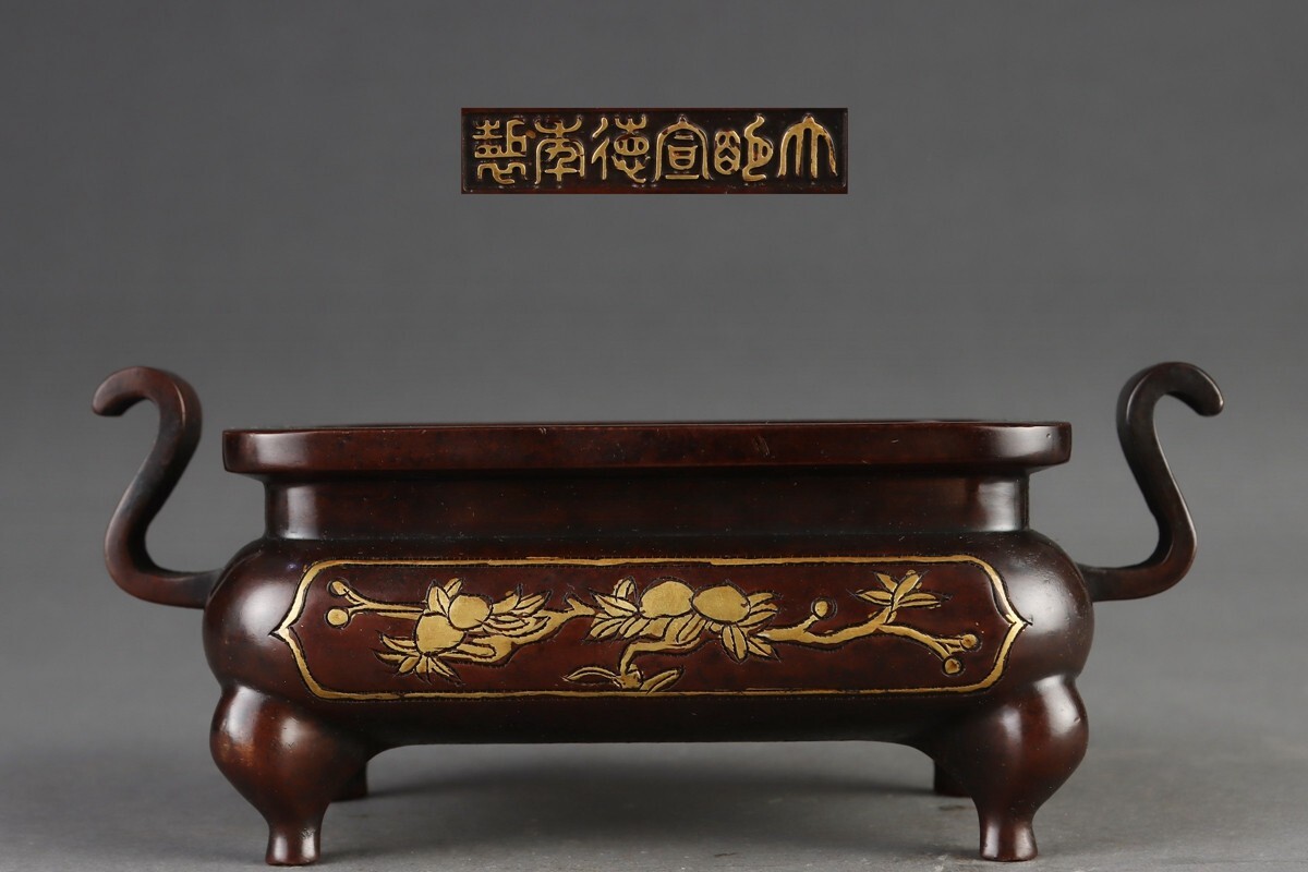 「明代 大明宣徳年製 古銅彫 塗金折枝紋 朝冠耳老銅香炉」旧銅器 置物擺件 賞物 中国古美術 旧蔵出