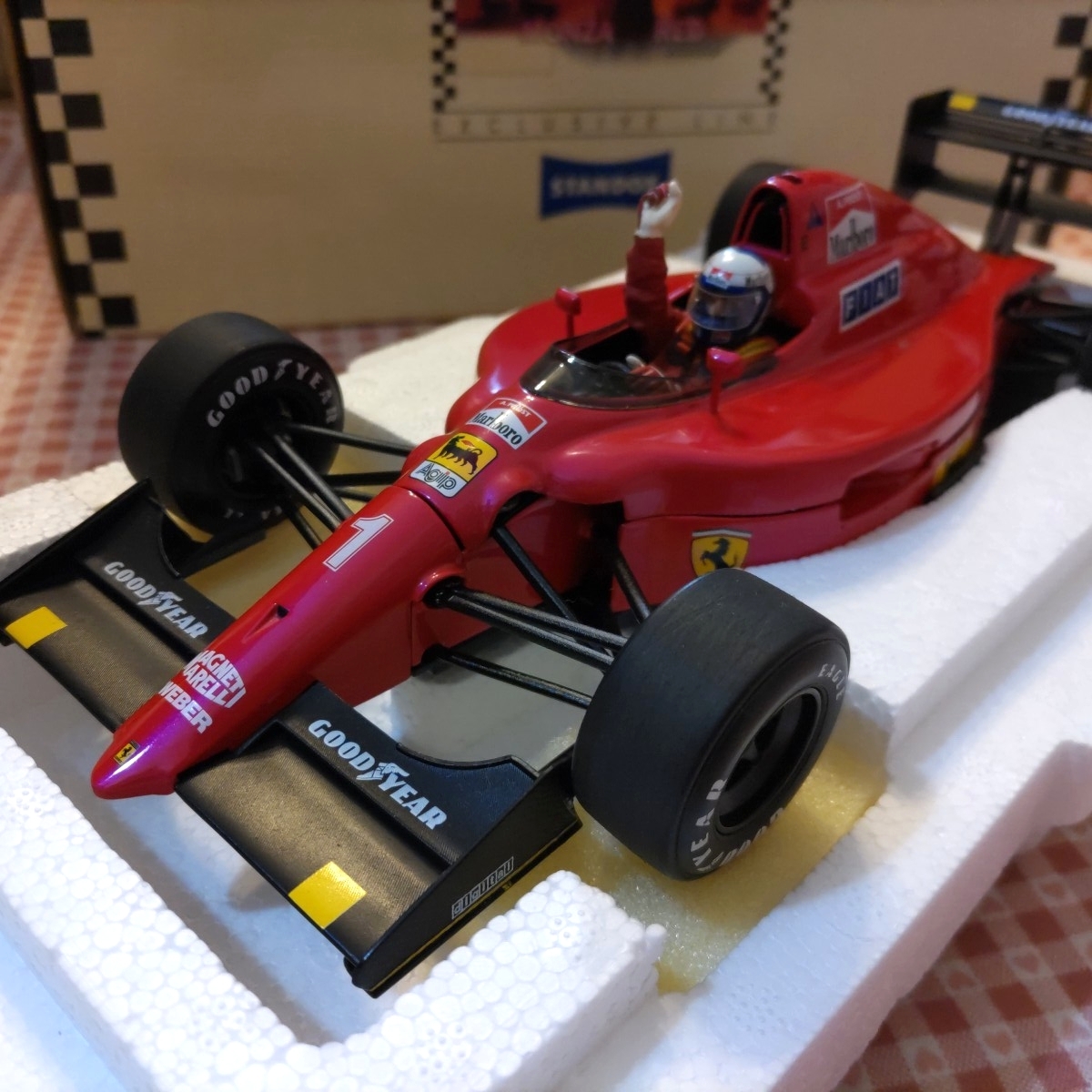 1990年にフェラーリのアラン・プロストがドライブしたマシンのexoto1/18スケールスペシャルカラーモデルです。「STANDOX」はドイツの老舗塗料メーカーでフェラーリGP100勝を記念して見る方向や光の当たり方で色が変わるスペシャル塗料を調合しこのモデルのボディに塗装しています。写真4枚目はフロントノーズの色がフェラーリレッドから変化しています。先日1台しか持っていないと思っていたSTANDOXが大事にして頂けそうな方にご購入頂きましたが、モデル部屋の最後に何ともう一台出てきました。退職に伴うコレクション整理です。内箱、外箱、封筒もあり、どれも綺麗な状態です。本当に市場では良好な個体が減っているうえ、STANDOXという極めて高い付加価値が付いたモデルを是非手に入れて下さい。宜しくお願い致します。