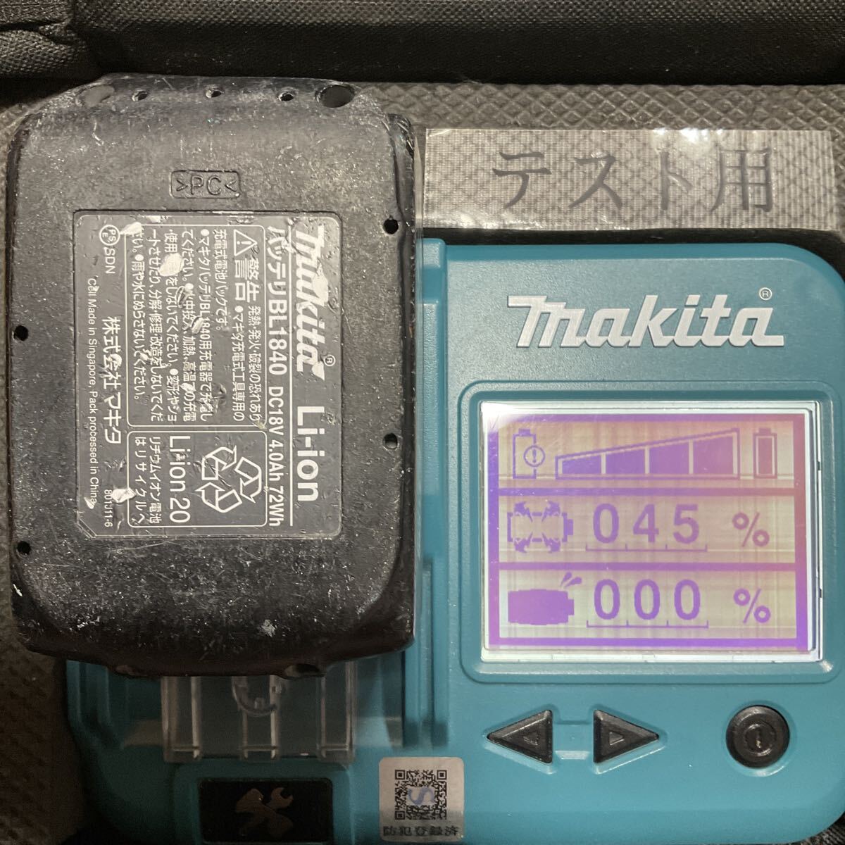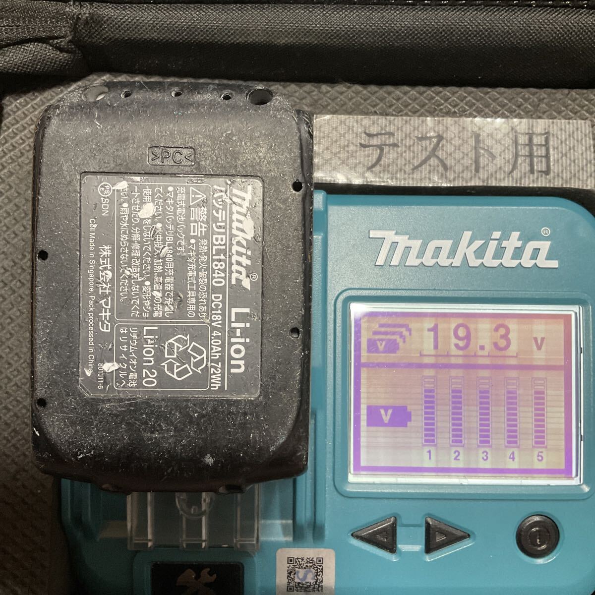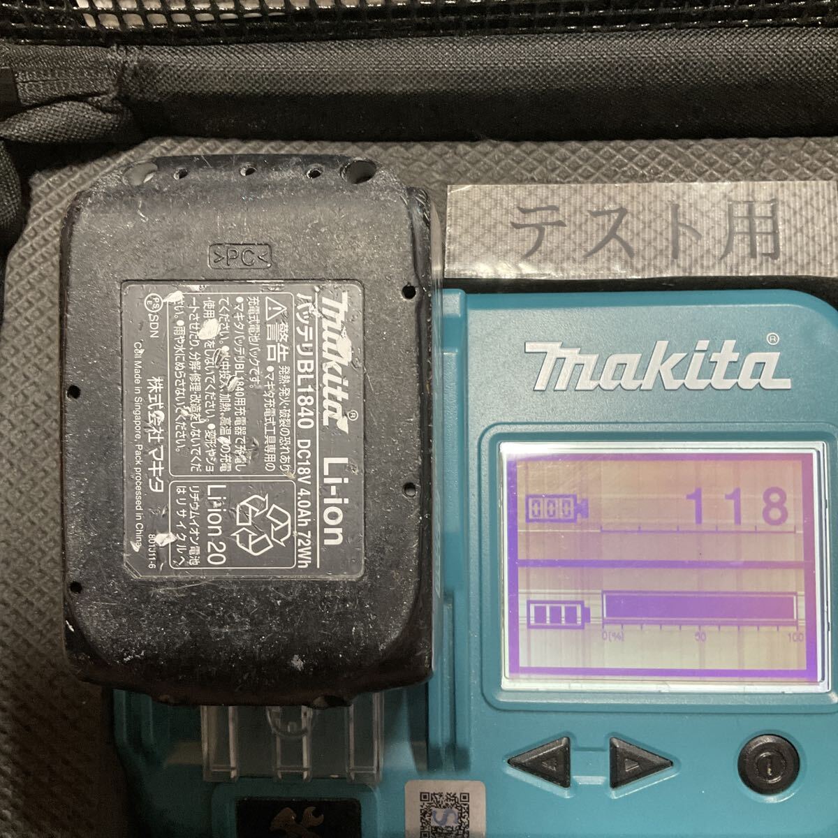 バッテリーBL1840(残量表示無し)の状態は、充電回数118回 バッテリー寿命4/4 過放電傾向45%・過負荷作業率0% 電圧19.3Vでした。