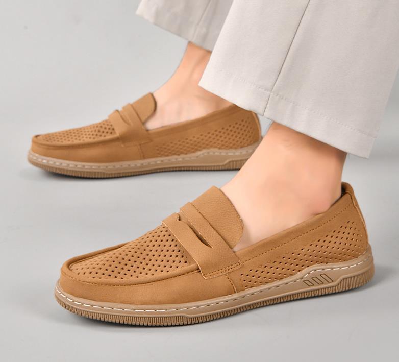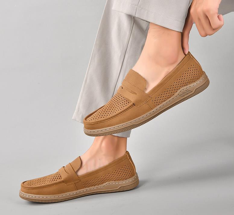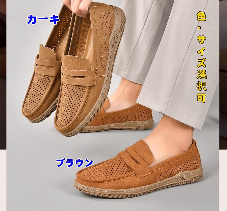 ローファー 透かし彫り スリッポン 通気柔らかい ドライビングシューズ カジュアルシューズ メンズ・新品 春夏靴 男性靴【26801-1】カーキ 24.0cm