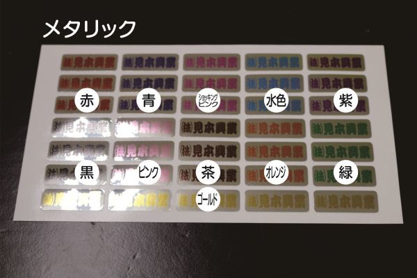 メタリック 社名・名前ステッカー 選べるベースカラー 合計150枚 道具・工具・事務用品・建築・建設・鳶・電気・自動車・塗装・運送 送料無料 選べるベースカラー11色 赤・青・水色・緑・茶・黒・紫・オレンジ・ピンク・ショッキングピンク・ゴールド | |