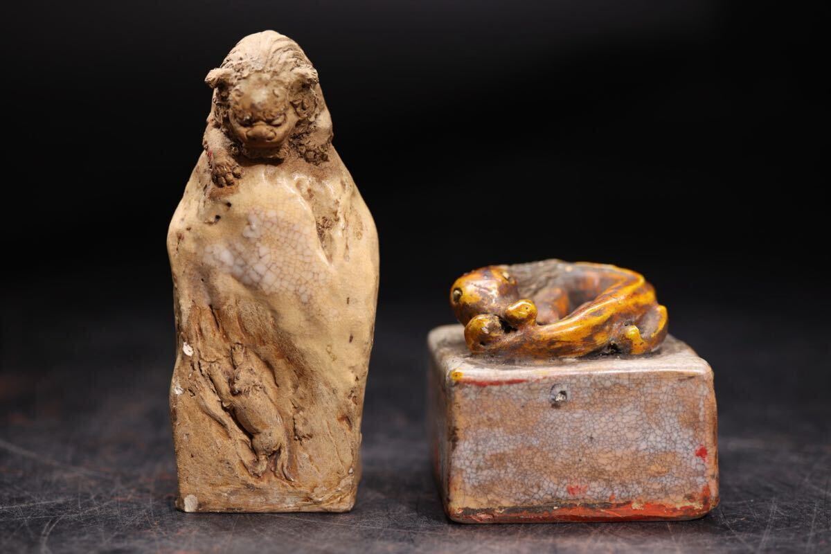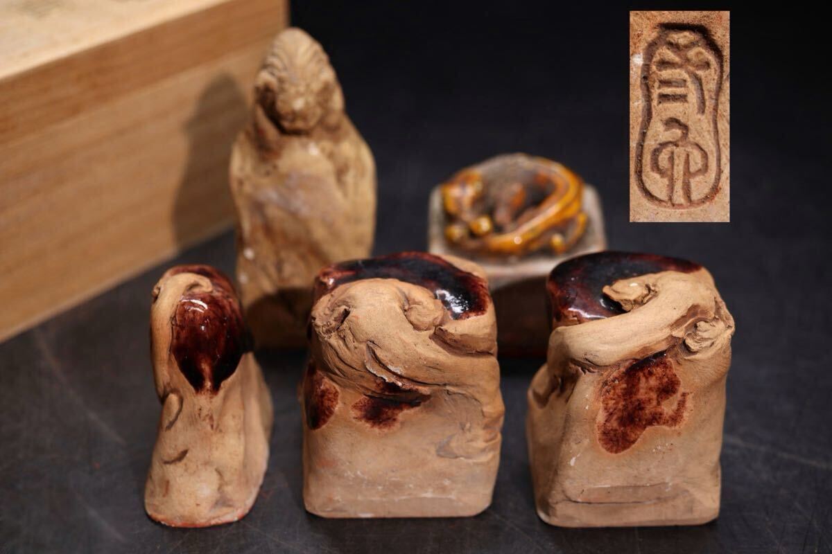 | 希少 二六 銘 二六焼 細工物 印 印材 まとめて 木箱付 / 霊芝 獣 彫刻 文房具 文房四宝 .G2195 |