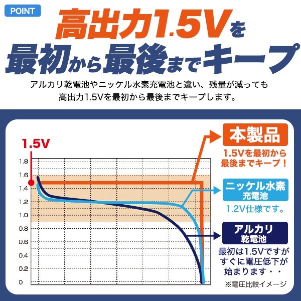 ・アルカリ乾電池やニッケル水素充電池と違い、残量が減っても高出力1.5Vを最初から最後までキープ!