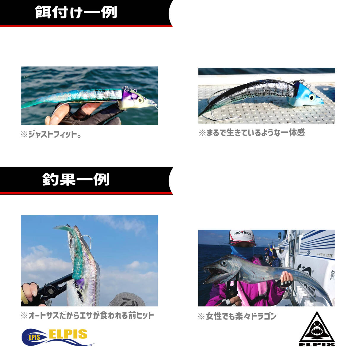 ELPIS社のガツガツドラゴン40号、太刀魚ヘッドの太刀魚テンヤです。超リアルなヘッドで太刀魚の共食い本能を誘発。全国各地で好釣果を果たした。ダブルフックで初心者のみならずベテランもドラゴンサイズと対戦する時圧倒的な安心感をもたらす。是非この機会にご入手してください。