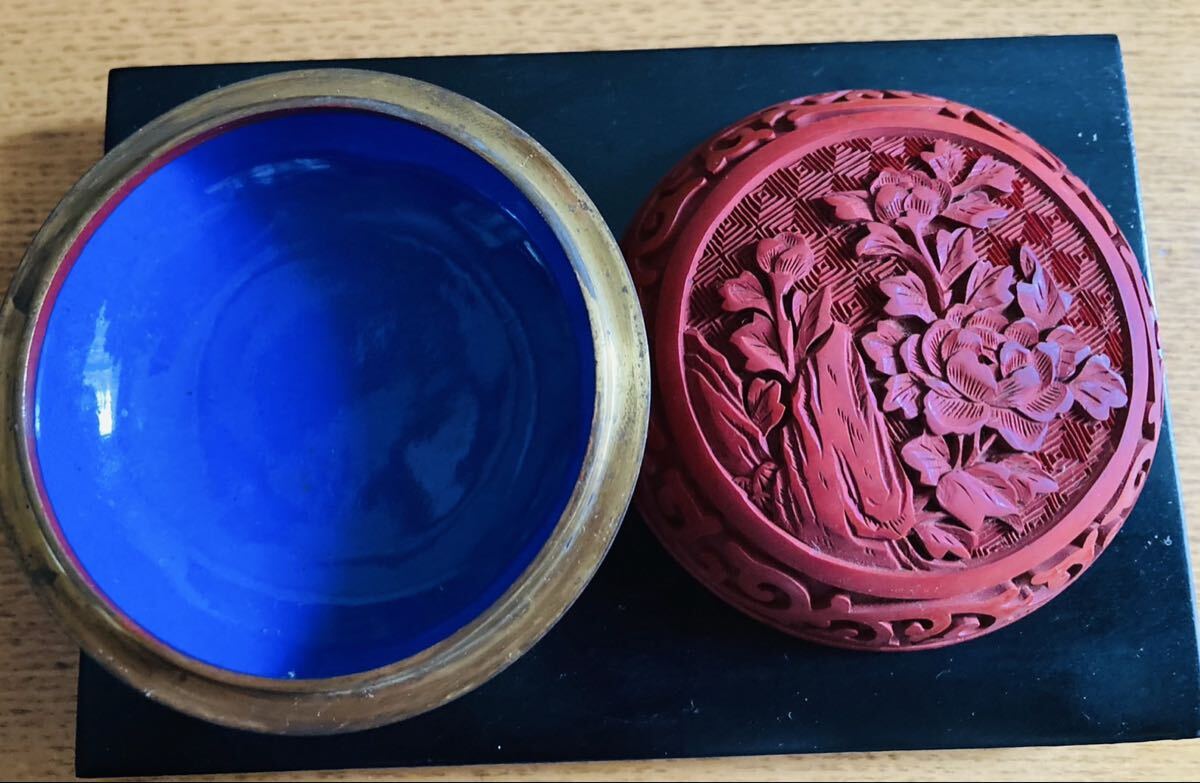 蓋を開けると、鮮やかな青と金縁が意外でもあり、はっとする美しさを感じるお品です。