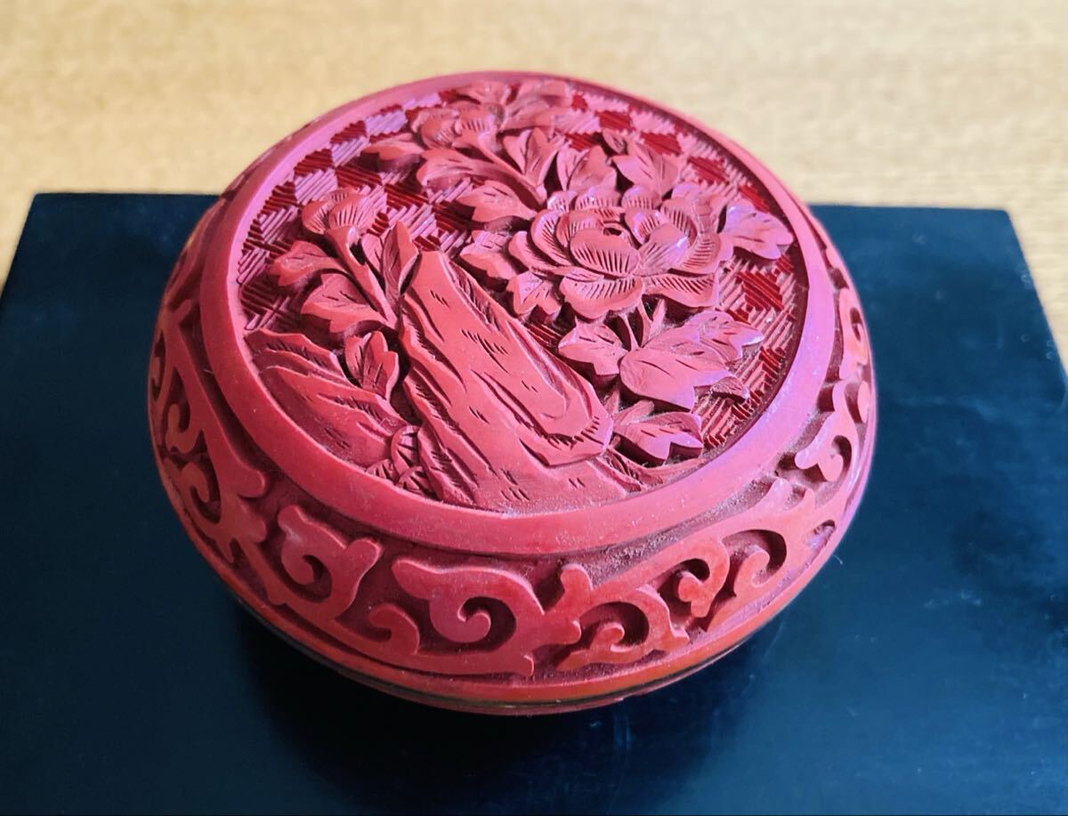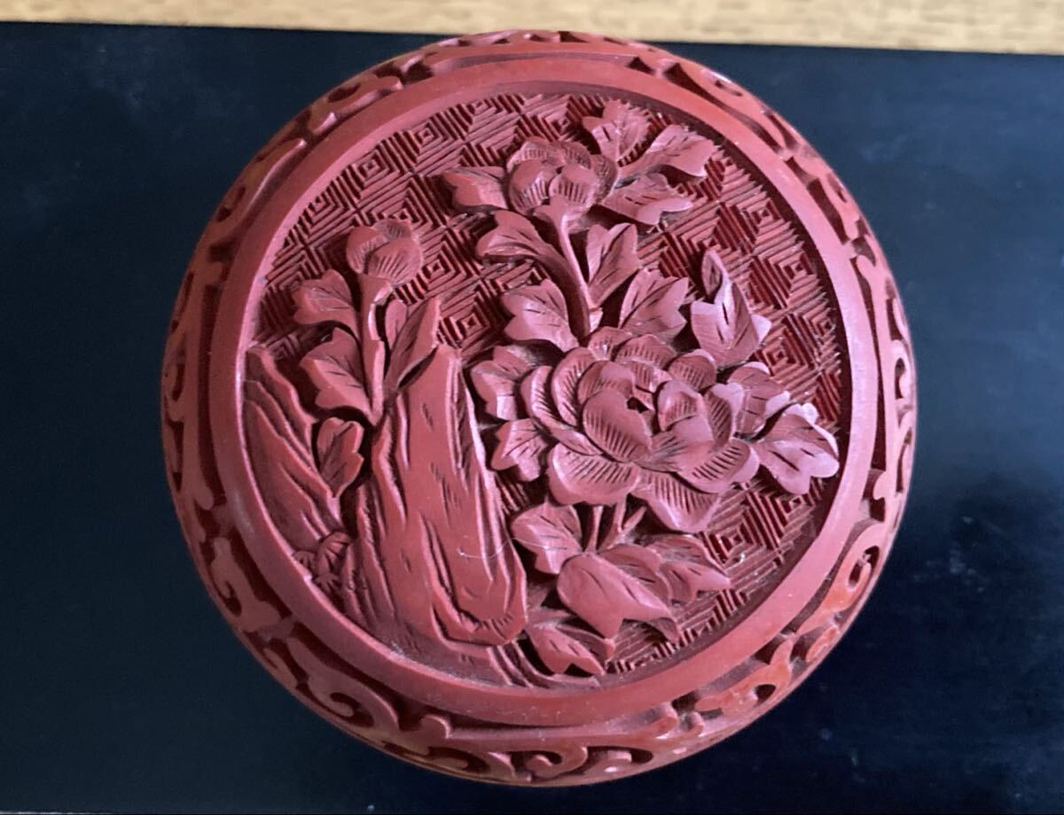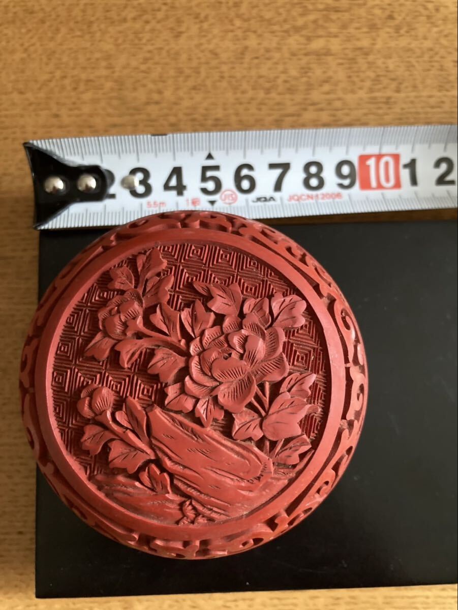 牡丹の花が描かれております。お花の背景も細かい模様が彫られていて凝ってます。写真をご参照下さい。