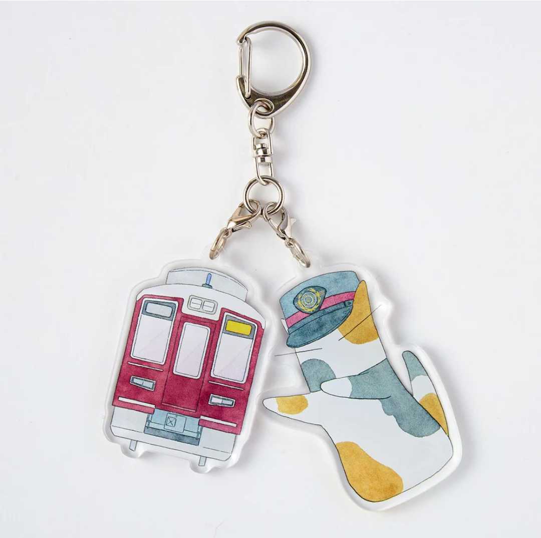 ■阪急電鉄とフェリシモ「猫部」がコラボレーション!阪急電車と、猫駅員さんがポーズをとる2連アクリルキーホルダー。阪急電車、猫さんのキーホルダーは取り外して1つずつでもお使いいただけます♪列車種別ごとのライトの光り方を、しっかり再現しているのもポイントです。