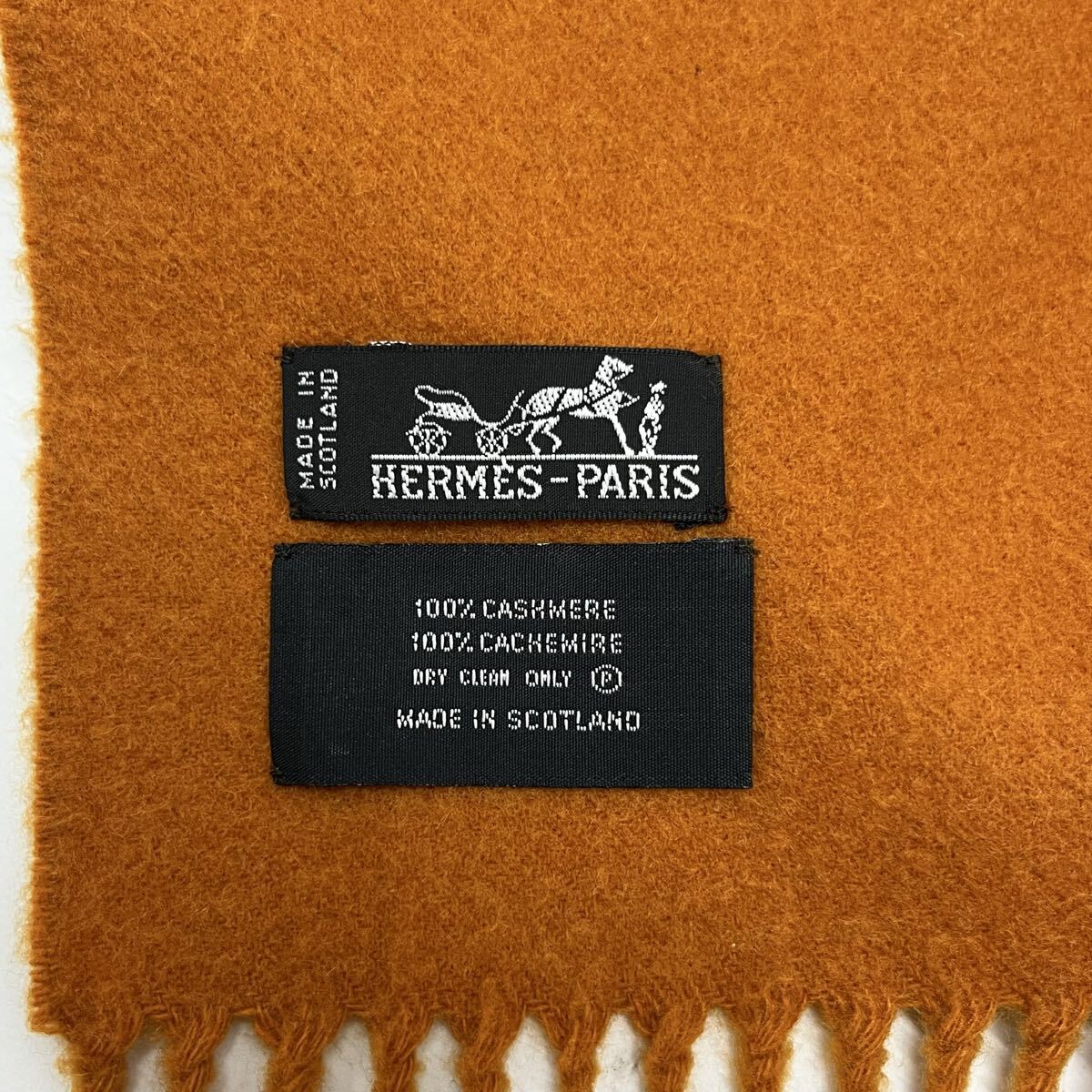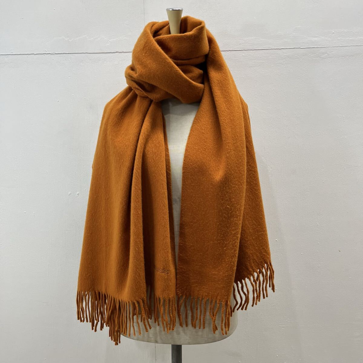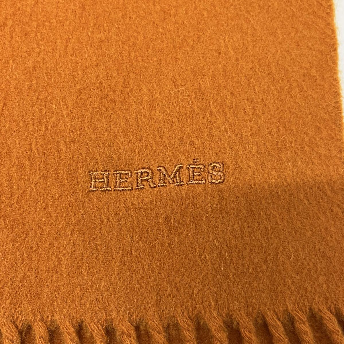 HERMES PARIS カシミヤマフラー カシミヤストール 大判マフラー 刺繍ロゴ ワンポイント フリンジ オレンジ エルメス【送料一律/同梱可能】Oの出品です。