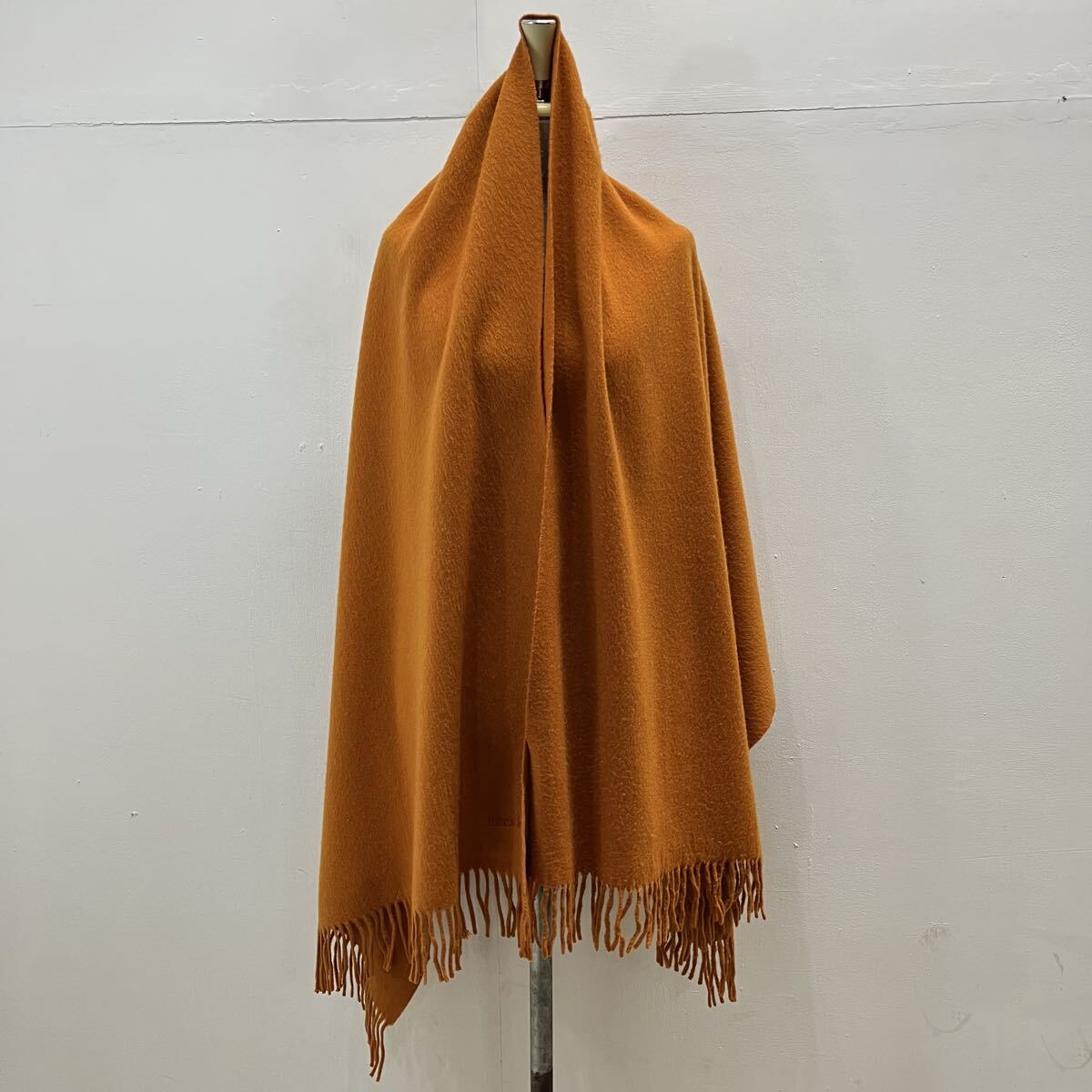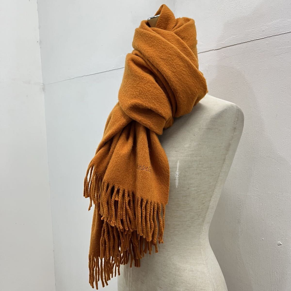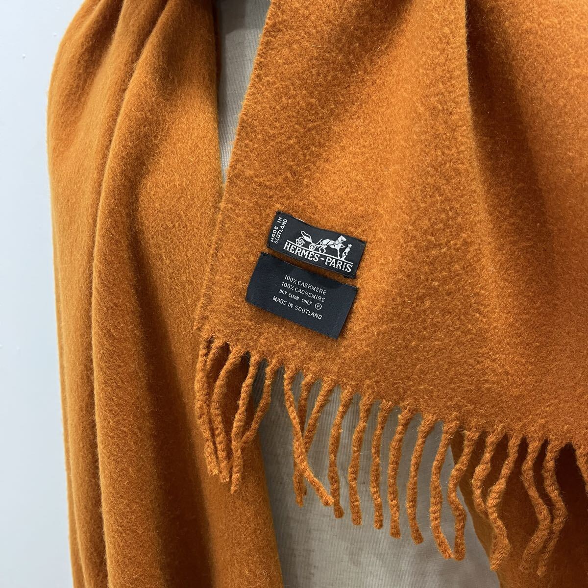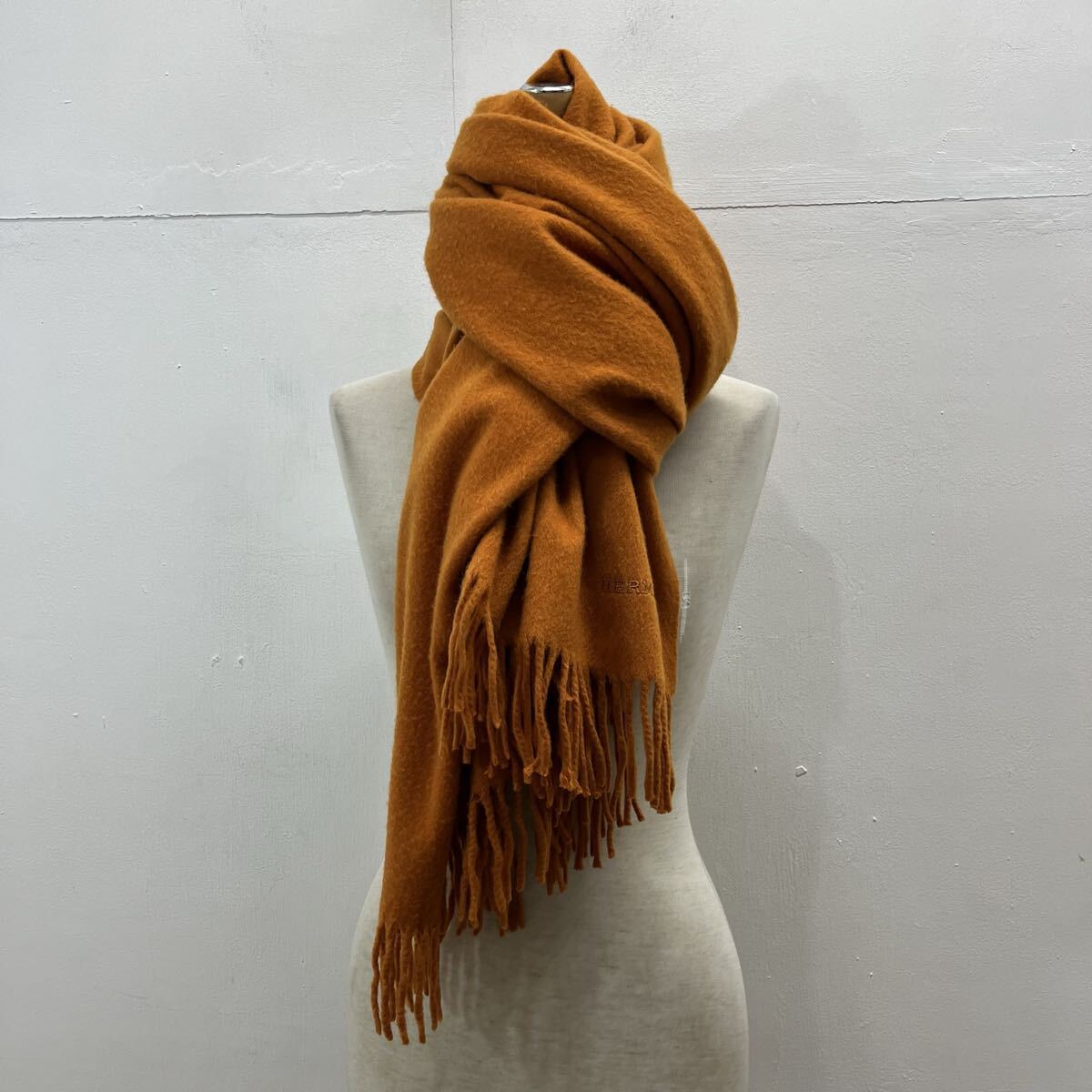 HERMES PARIS カシミヤマフラー カシミヤストール 大判マフラー 刺繍ロゴ ワンポイント フリンジ オレンジ エルメス【送料一律/同梱可能】Oの出品です。