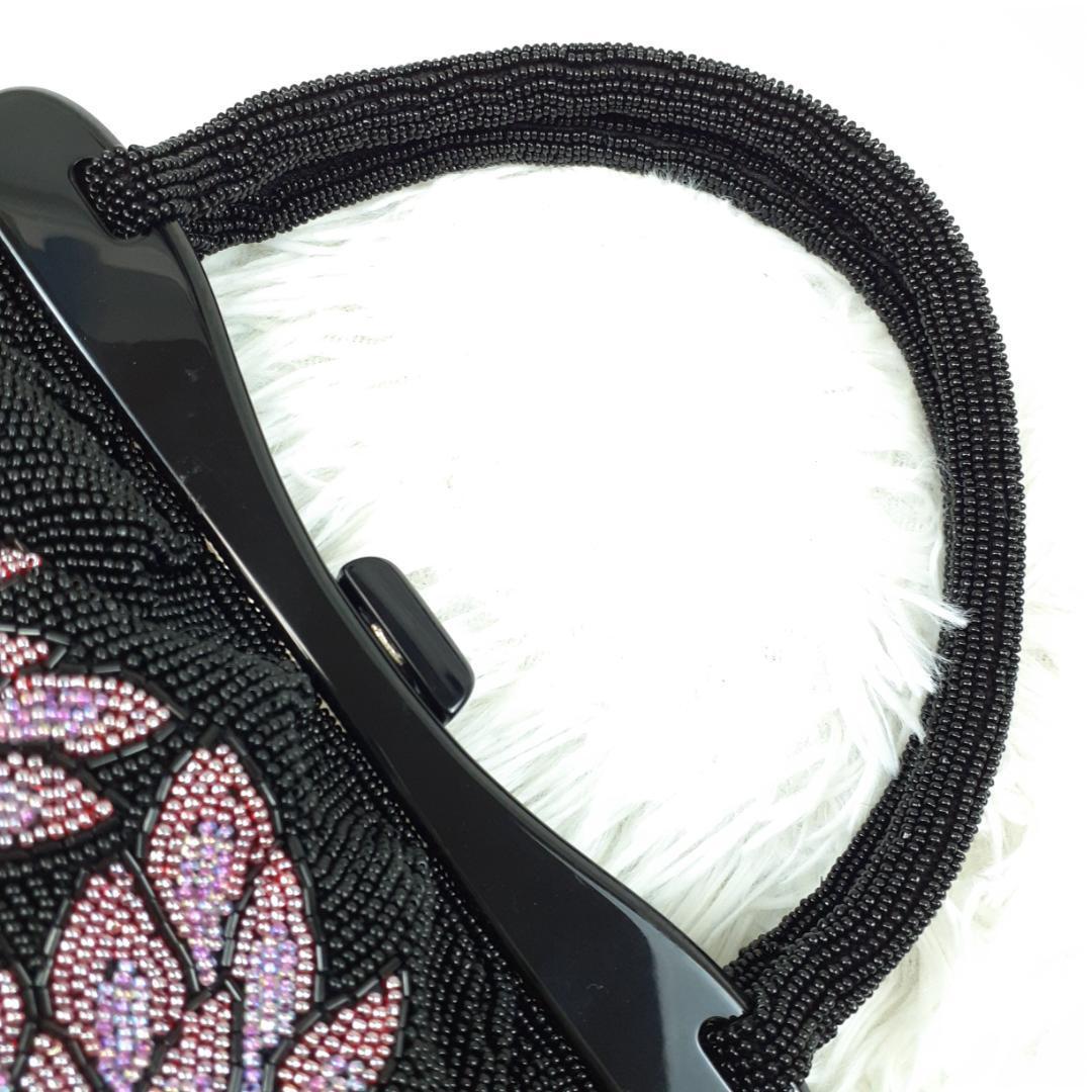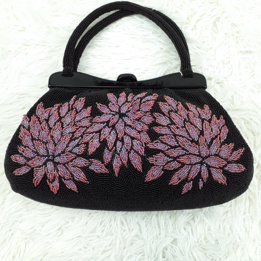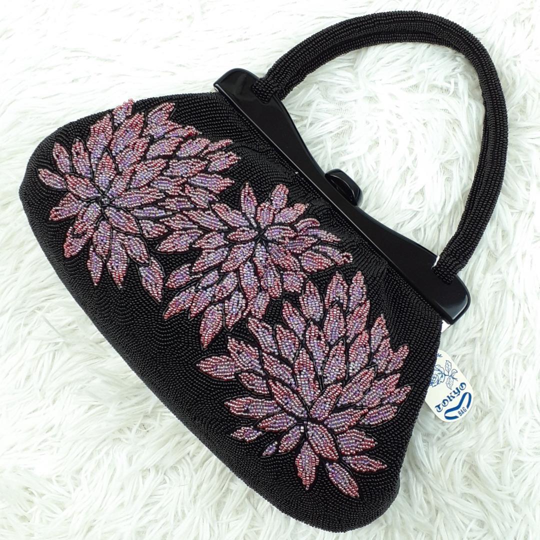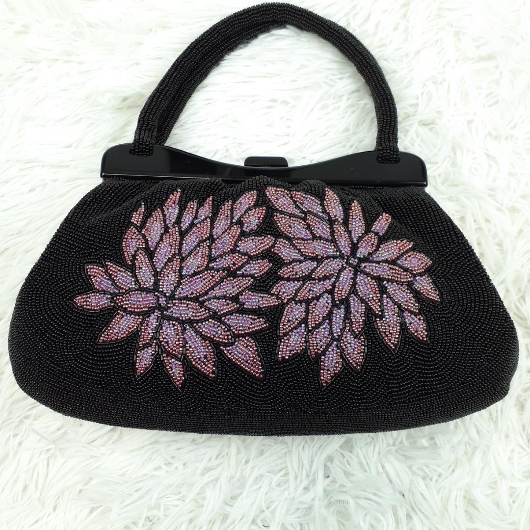 タグ付き未使用保管品◎ギンザワコウ 銀座和光 ハンドバッグ ビーズバッグ ブラック 黒 パープル 紫 総ビーズ 菊文様