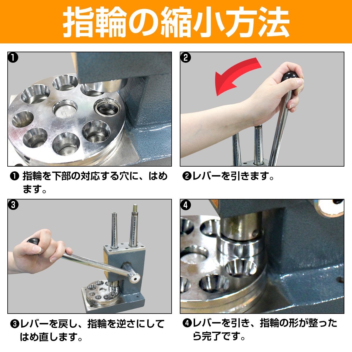 下部穴に指輪を押し付けてレバーを手前に倒すと指輪のサイズをダウンします。