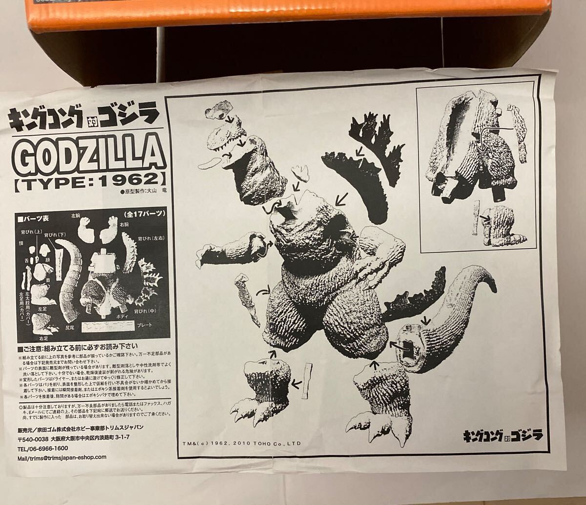 トリムスジャパン製 キングコング対ゴジラ版ゴジラ1962 通称キンゴジです。大山竜氏による原型で、怪物屋アトラゴンから限定販売された後、トリムスジャパンより限定再販されたレジンキャストキットです。販売数が少なく大変希少な上、とても素晴らしいキットのため、サンプル画像5、6のとおり、エクスプラスよりFAVORITE SCULPTORS LINEとしてソフビ版塗装済み完成品で販売されました。個人的にはこのサイズでは1、2を争うほどのキンゴジだと思っております。いつかはキャスト版を作成したいと思っていた方は、この機会にいかがでしょうか。もう手に入れることは、かなり厳しいと思います。未組立品ですが一度人の手に渡ったものであるということを踏まえ、ご理解・ご了承いただける方は、ノークレーム・ノーリターンでお願い致します。