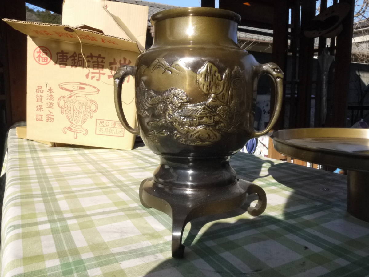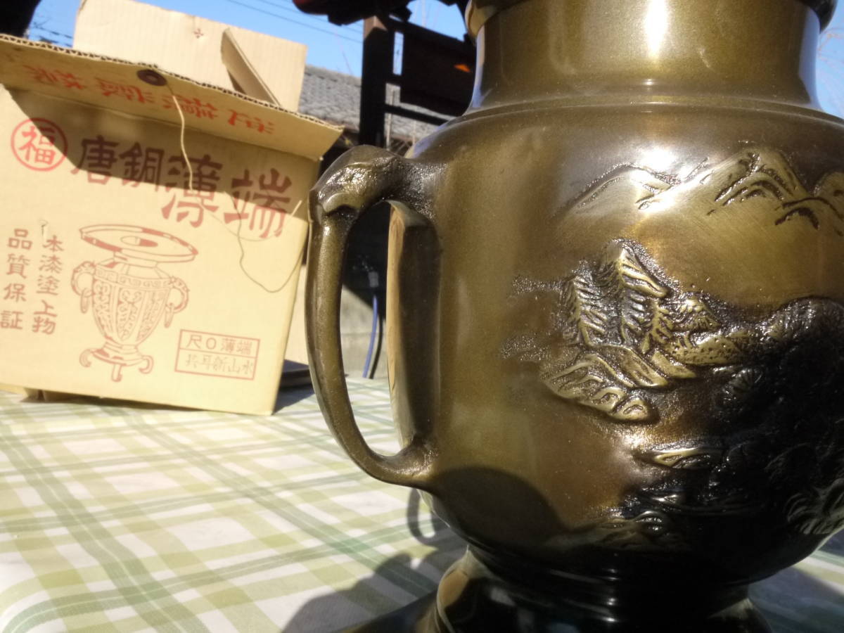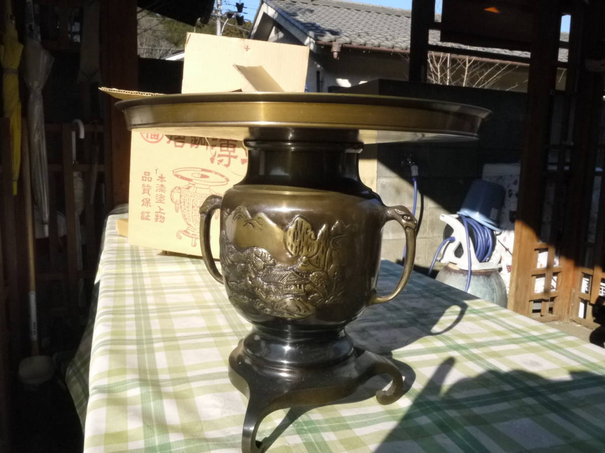 ★【TS30106】未使用 薄端 共耳新山水 三足 銅花器 唐銅 池坊 茶道具 華道具 フラワーベース インテリア