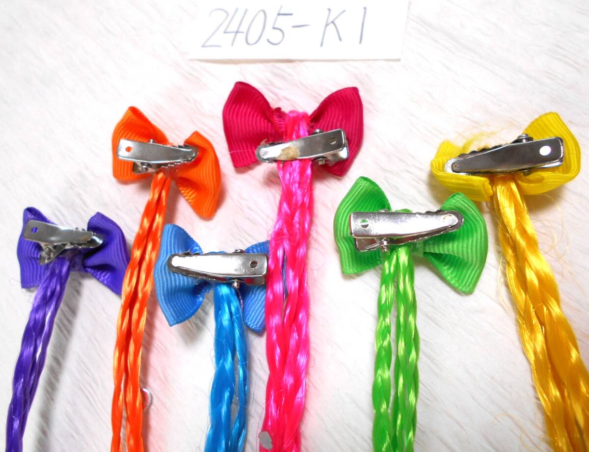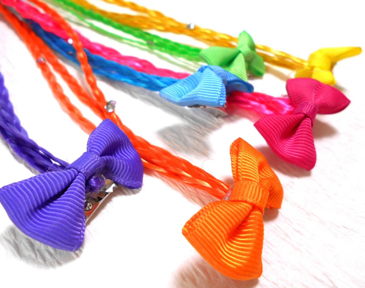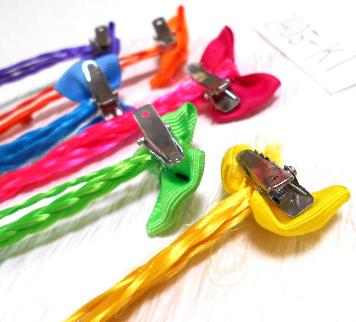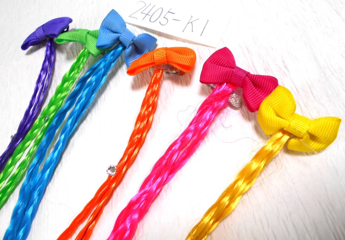 黄、紫、柿色、水色、ローズ、黄緑のリボンのクリップのついた飾りです。