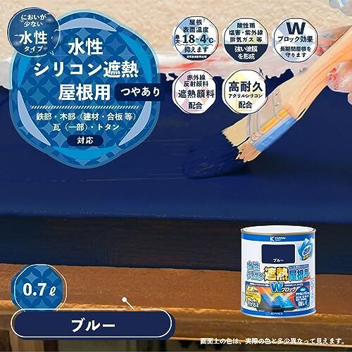 特徴遮熱がある塗料遮熱顔料(特殊遮熱顔料・赤外線反射顔料)+アクリルシリコン樹脂(酸性雨・塩害・紫外線・排気ガスなどに強い塗膜を形成)のにより超高性能塗膜がWブロック。銀黒は赤外線反射顔料を配合しておりません。 最大18℃~4℃抑えます赤外線反射顔料が赤外線を反射し、屋根の表面温度上層を最大18℃~4℃抑えます。(当社従来塗料比較) 屋外特有のダメージからガード アクリル・シリコン樹脂配合により酸性雨、塩害、紫外線、排気ガスなどの汚れに強い塗膜を作り、建物の外観を美しく保ちます。 熱による劣化からガード 遮熱により従来の塗料に比べ熱による劣化を防ぎます。 優れた耐水性耐水性に優れ、お住まいの屋根を雨水から守ります。 使いやすいペンキ速乾で、臭いが少なく、安全で環境にやさしい水性塗料です。 カビからガード 強力防カビ剤配合で、長期間カビの発生を防ぎます。 作業性が良い速乾性の為、時短作業や作業工程の短縮にも。 さらに遮熱を高めるには別売りの水性シリコン遮熱屋根用を下塗りにご使用頂くと、さらに遮熱を高められます。 用途用途以外には使用しないで下さい。 屋根セメント瓦 / スレート瓦 / トタン / 新生瓦(カラーベスト・コロニアルなど)新しいトタンは塗料の付着が悪いので、半年位放置後、表面のギラギラがなくなってから下記いずれかの下塗りを施してから上塗りをして下さい。 1.弊社品「さび止めシリーズ(水性または油性)」 : / さび止め。 2.弊社品「水性シリコン遮熱屋根用専用下塗り剤」 : / さび止め & 遮熱が大幅にUP。 瓦に塗装する場合は、専用下塗り剤を使用する前に、弊社の『油性密着シーラー』をご利用ください。(新築・新品の瓦は除きます。) 木部・鉄部建材/ 合板 など。 塗れないもの 瓦釉薬瓦 / 無釉薬粘土系瓦 / 施釉セメント瓦 / 施釉コンクリート瓦 / 乾式洋瓦(モニエル瓦) / シングル系瓦 / 天然石瓦 板材ガルバリウム鋼板 / 塩ビ鋼板 / フッ素鋼板 / 銅板、ステンレス板 / アルミ板 / 樹脂板 材質の種類を確認してからご使用ください。 乾燥・塗り重ね時間 20℃乾燥時間:約 1 時間 塗重時間約 4 時間 冬期乾燥時間:約 2 時間 塗重時間:約 6 時間 塗り面積(2回塗り) 0.7L平方メートル:約 2.5 ~ 3.5m2 タタミの広さ:約 1.8 枚分 1.6L平方メートル:約 5 ~ 8m2 タタミの広さ:約 4 枚分 3L平方メートル:約10 ~ 15 m2 タタミの広さ:約 8 枚分 7kg平方メートル:約 22~ 32 m2 タタミの広さ:約 16 枚分 14kg平方メートル:約 45~ 64 m2 タタミの広さ:約 33 枚分 塗装時の注意 ひび割れ、穴、目地などがある場合コーキング材、速乾セメントなどで埋め、できるだけ平らにしておきます。塗料の塗れないコーキング材もあるので要注意 瓦の隙間のコーキング瓦の重なり部分や突き合わせ部分の隙間は、コーキング材や塗料で埋めないようにしてください。水はけが悪くなり雨漏りの原因となります。 吸い込みのある面吸い込みのある面はつやが出にくくなることがあります。乾燥後更に塗り重ねてください。 色味が違って見える色は塗装後の色が色見本と異なって見える色(ネオブラック等)がありますが、乾燥すると見本と同じ色味になります。 油性密着シーラーを使う時の注意点油性密着シーラーがコーキング材を侵す場合があり、上塗り塗料が上手く塗れない場合があります。 油性密着シーラーを塗装後にコーキング材を使用してください。 熱い瓦に塗る時は夏場はできるだけ早朝から作業し、直射日光で屋根の表面が熱くなる前に塗装してください。瓦が熱くなり泡が吹き易くなります。熱い瓦に塗る時は、水で更に5%前後うすめて塗ります。 表面が塗れている場合は塗らないで塗装面が濡れていたり湿っていると乾燥が遅れ、塗膜異常の原因になります。雨上がりや水洗いしたときは1日以上乾燥させてから塗ってください。 うすめ液・用具の洗浄 水 (塗りにくくなった時だけ5%以内で薄めます)