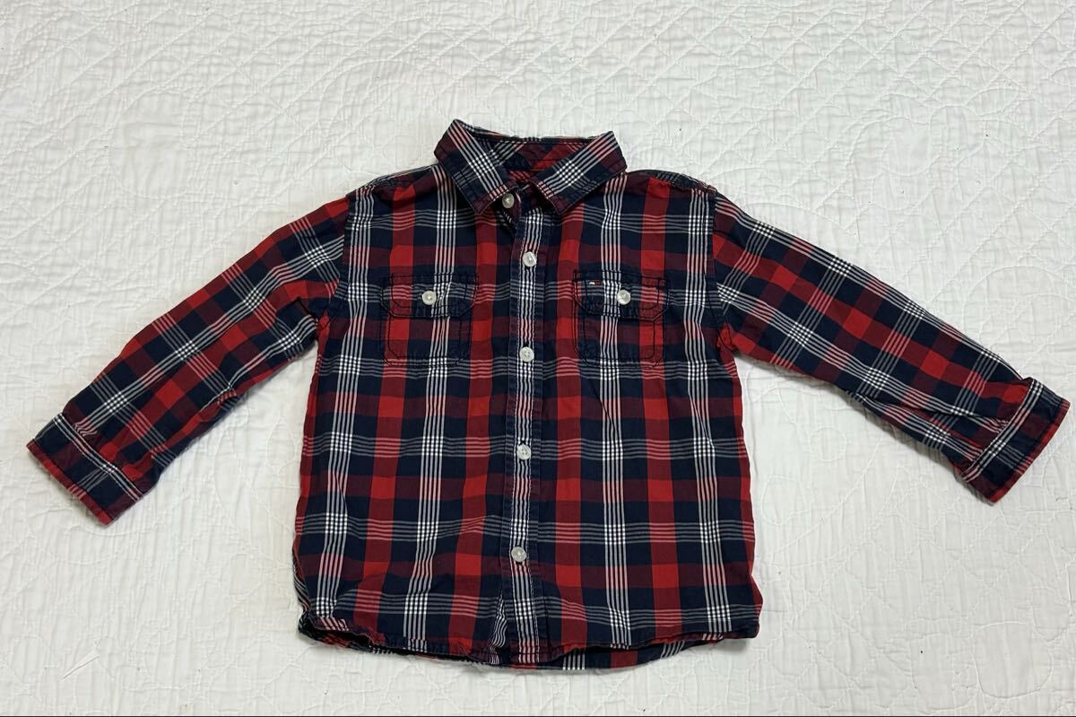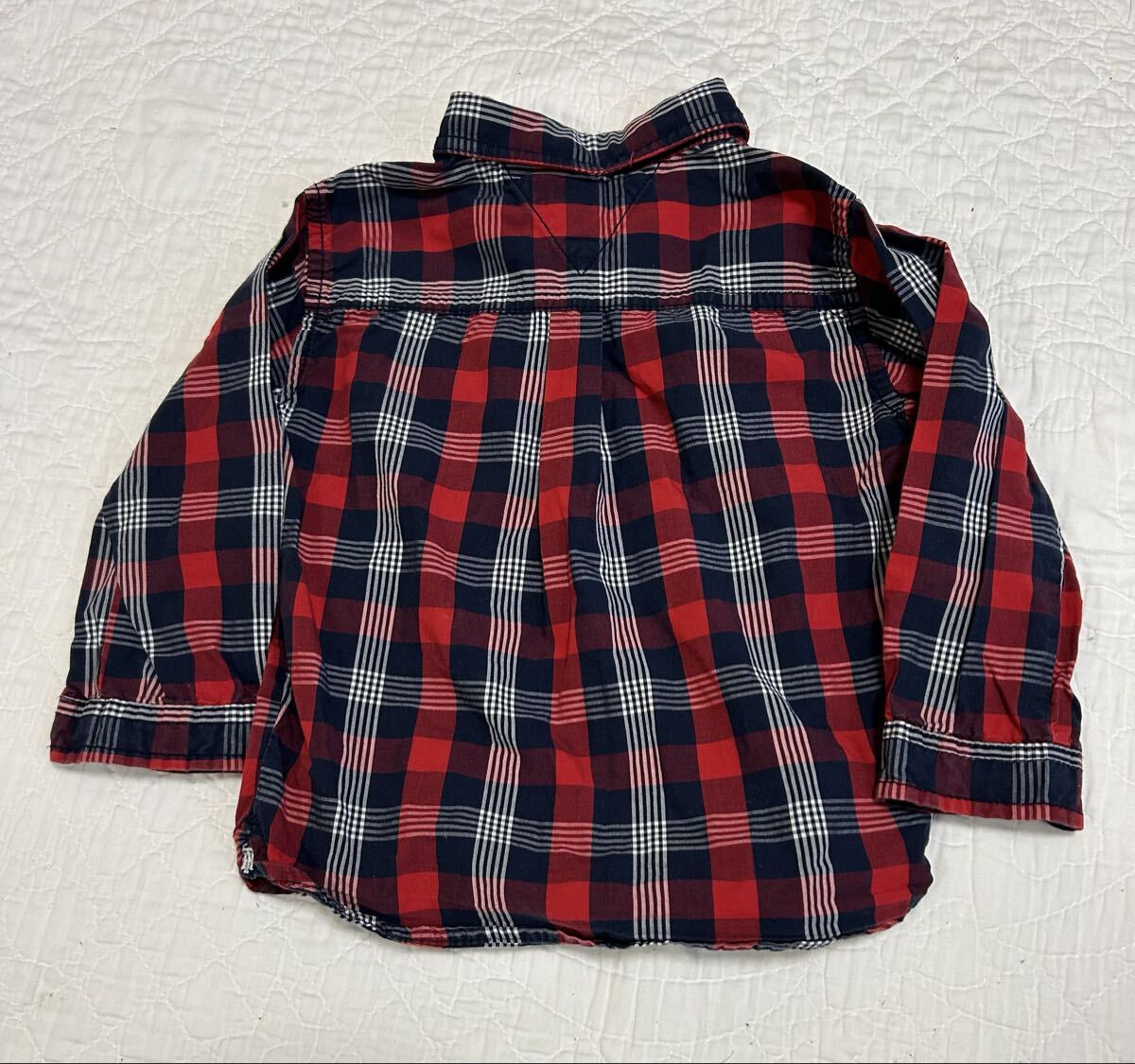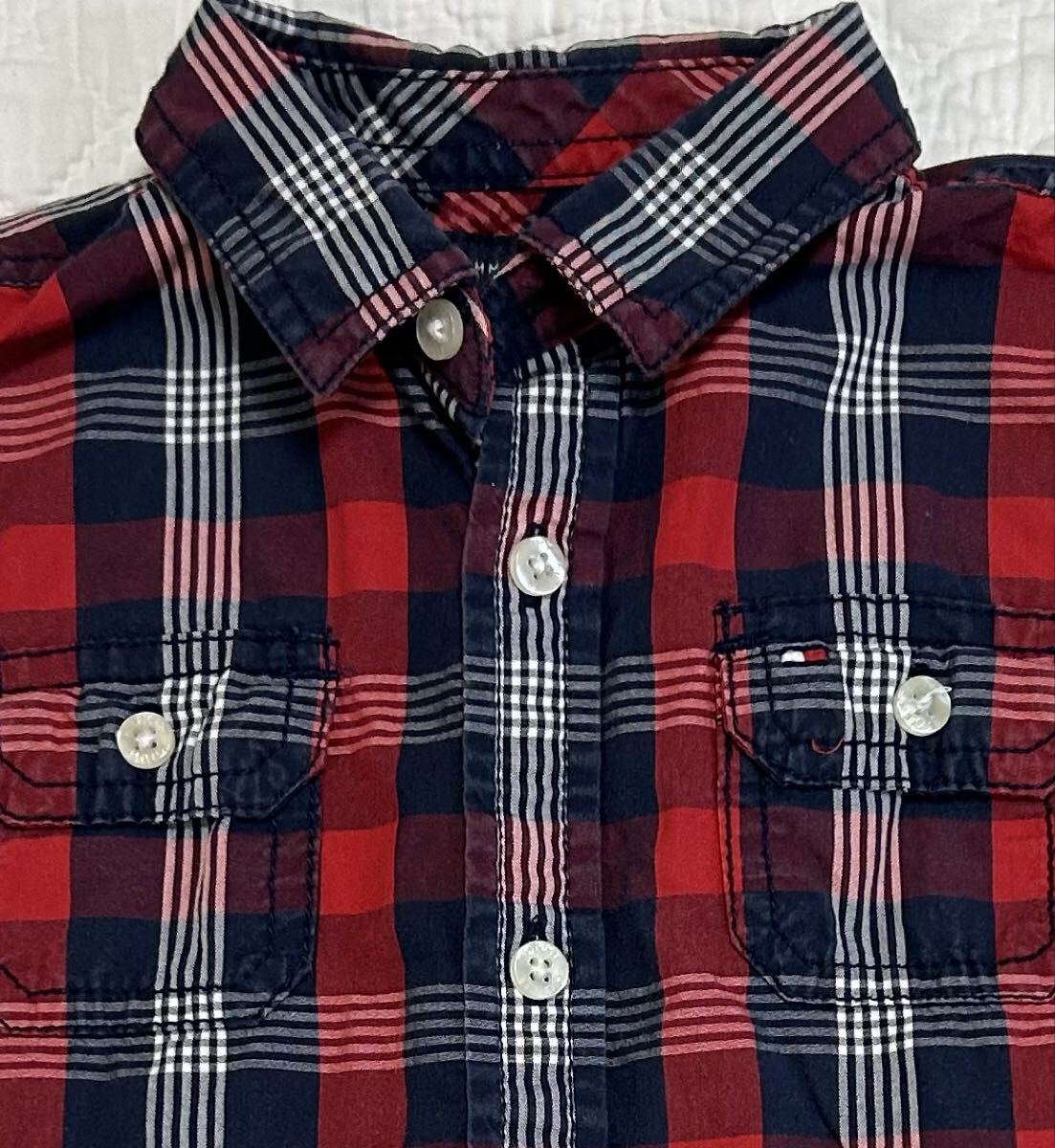 赤・紺・白のチェック柄の長袖シャツ、ボタンとポケット付き。