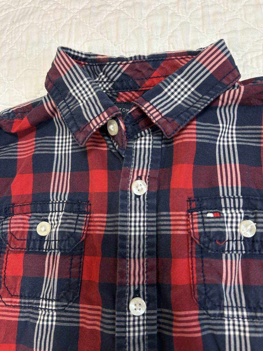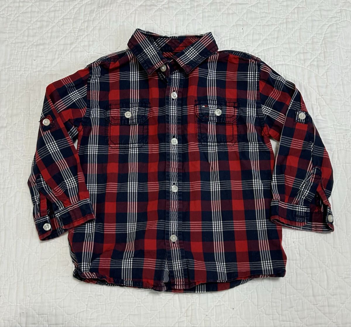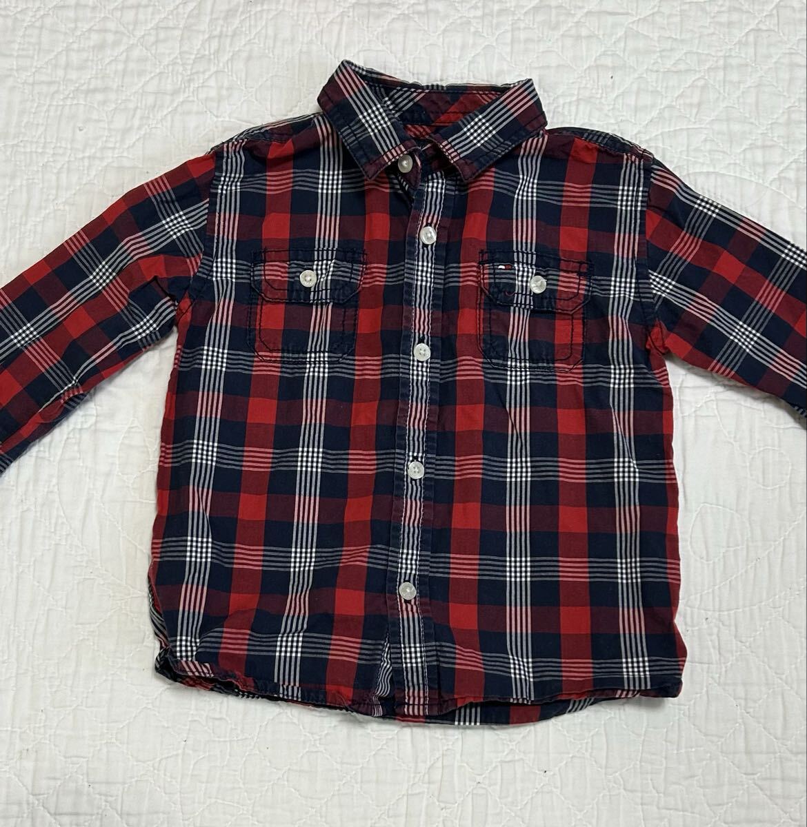 赤・紺・白のチェック柄の長袖シャツ、ボタンとポケット付き。