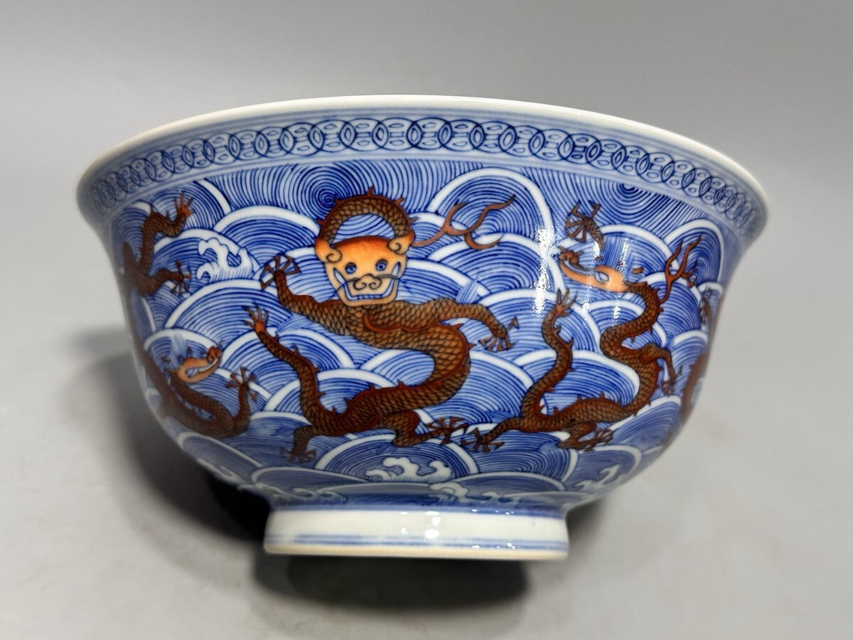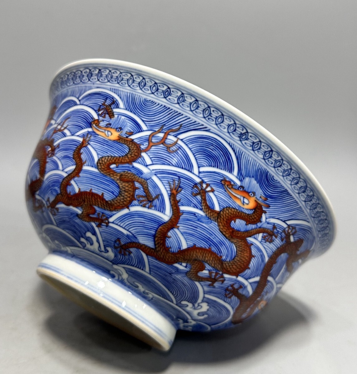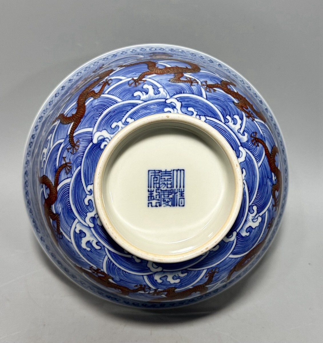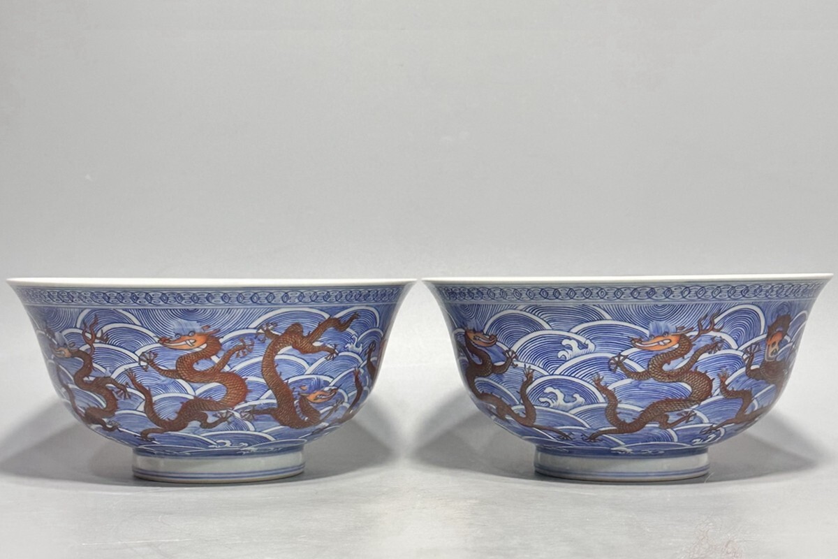 清代 大清嘉慶年製 陶磁器 青花龍紋礬紅彩海水紋 碗一対【仁】染付 置物擺件 古賞物 古美術 中国古玩 蔵出