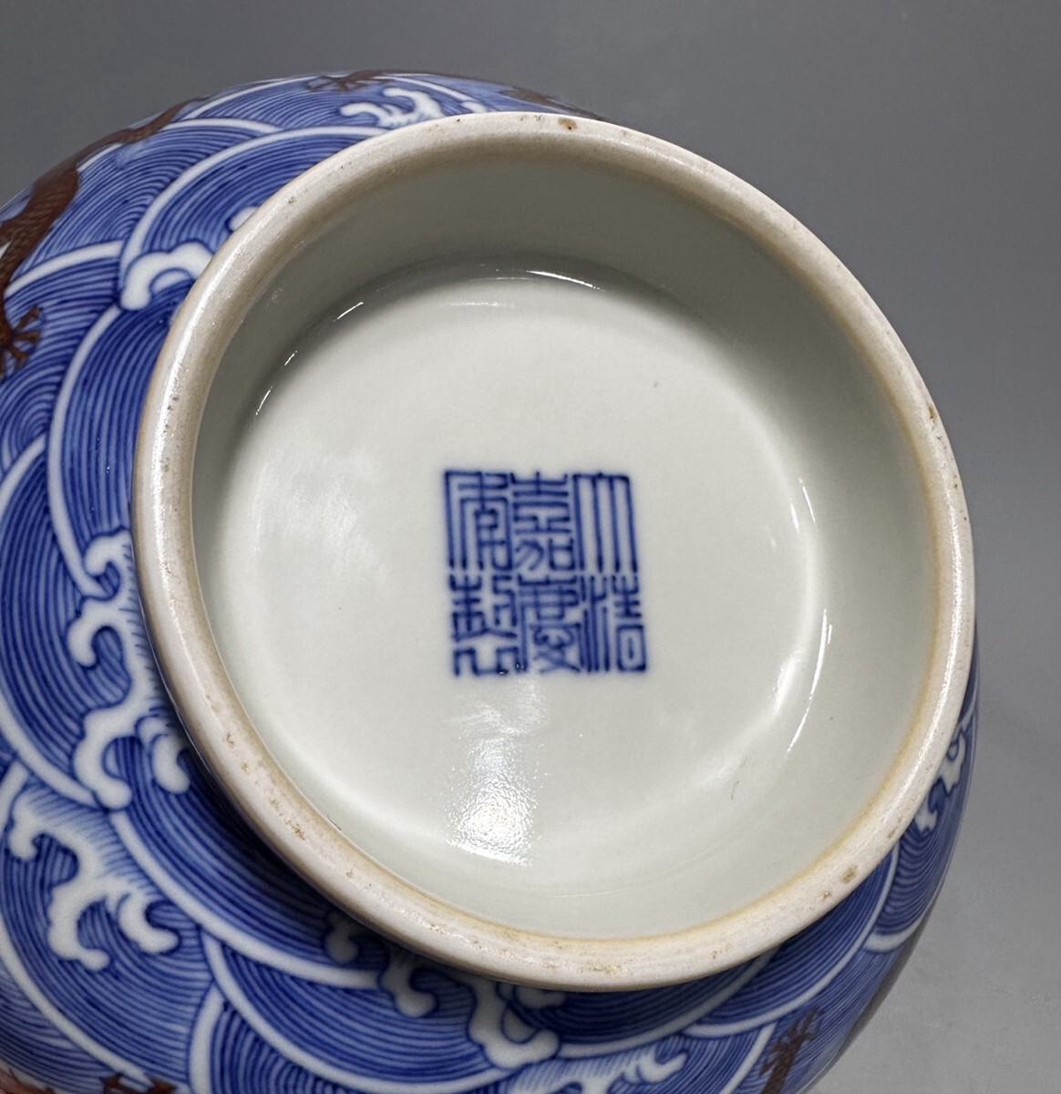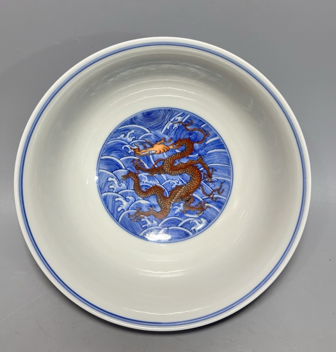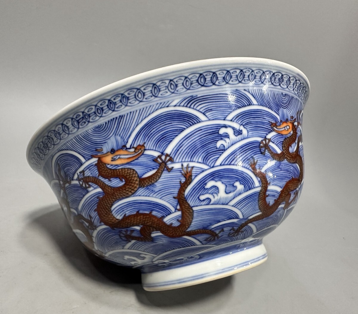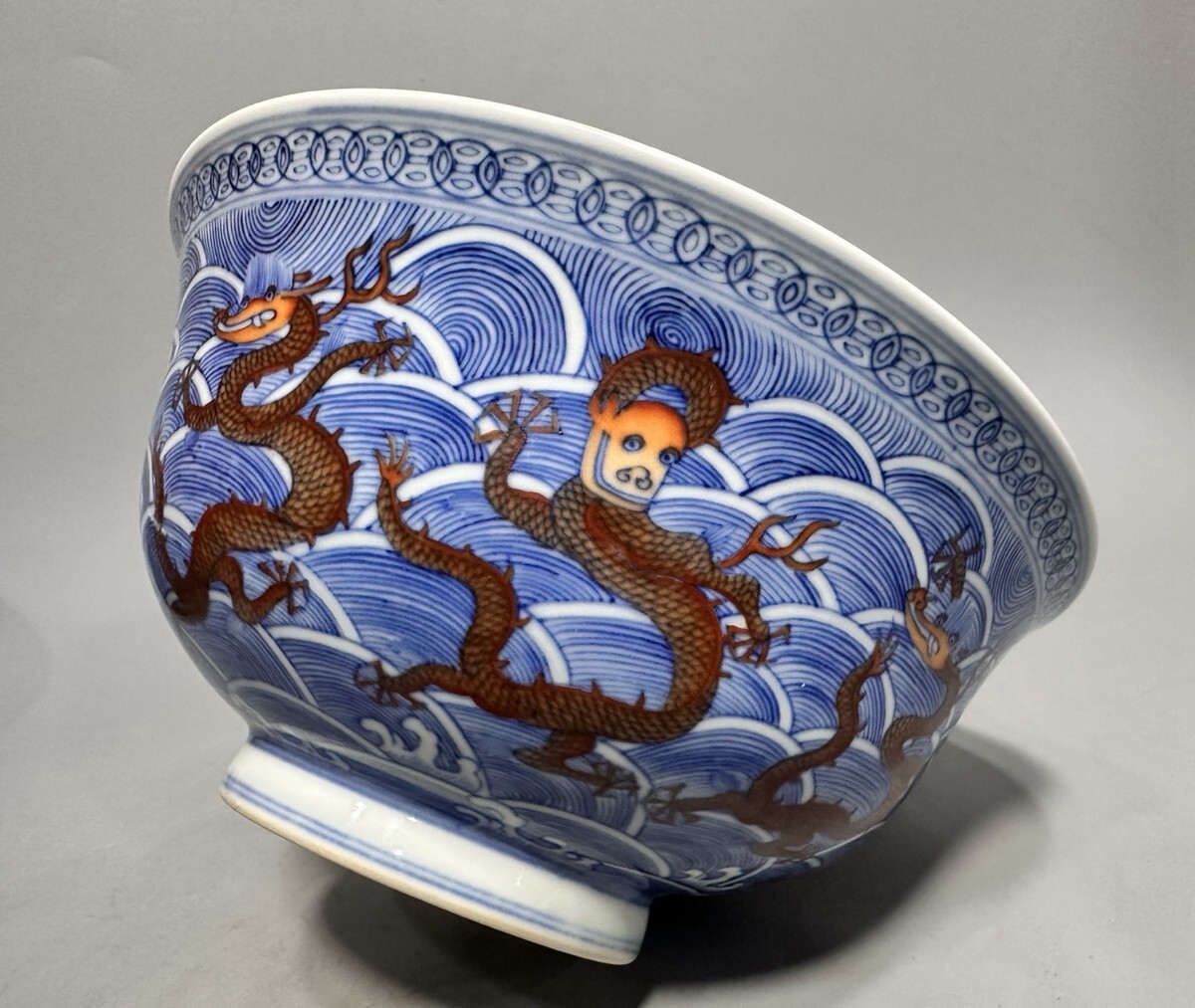 清代 大清嘉慶年製 陶磁器 青花龍紋礬紅彩海水紋 碗一対【仁】染付 置物擺件 古賞物 古美術 中国古玩 蔵出