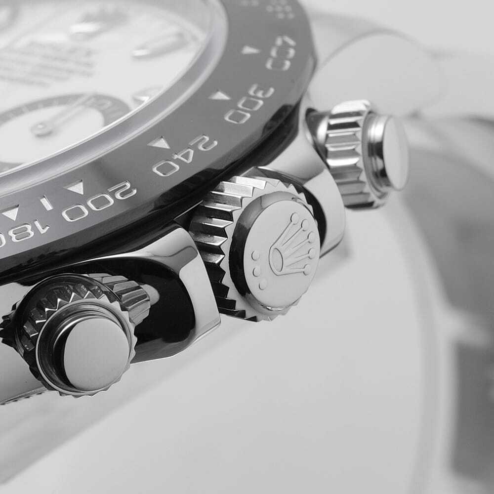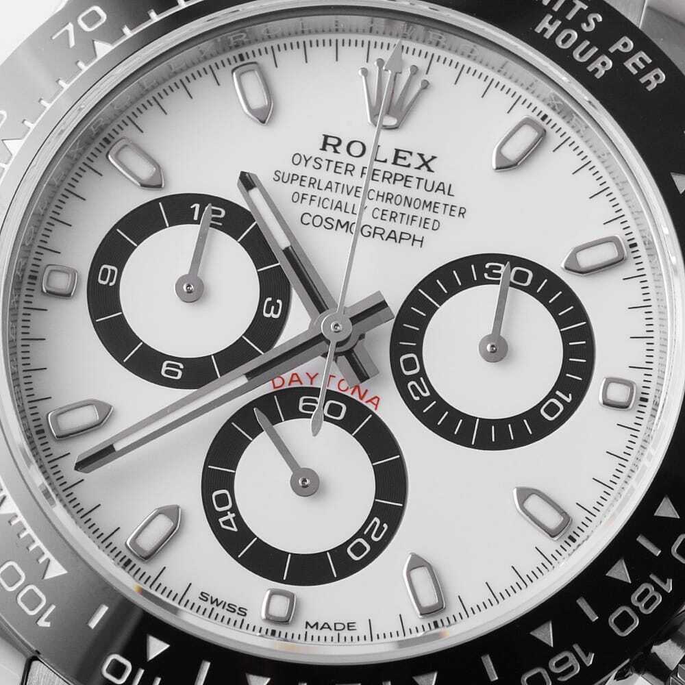 | モデル情報 | 2016年のバーゼルワールドで発表されたデイトナ Ref.116500LNです。ベゼルがステンレスからセラクロムへ変更されたことにより、耐蝕性と耐傷性に優れ紫外線による影響を受けにくいという進化を遂げました。ムーブメントはパワーリザーブ約72時間のCal.4130を搭載。防水性100m仕様。ダイアルはブラックとホワイトの2色展開となりますが、どちらも甲乙つけがたい精悍さが際立つ大人気モデルです。 |