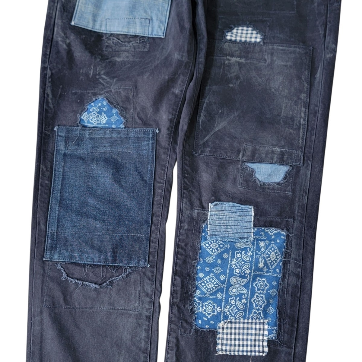 元々、色落ち含めたユーズド加工やパッチワーク加工が入った状態のモデルとなります。予めご了承下さい。