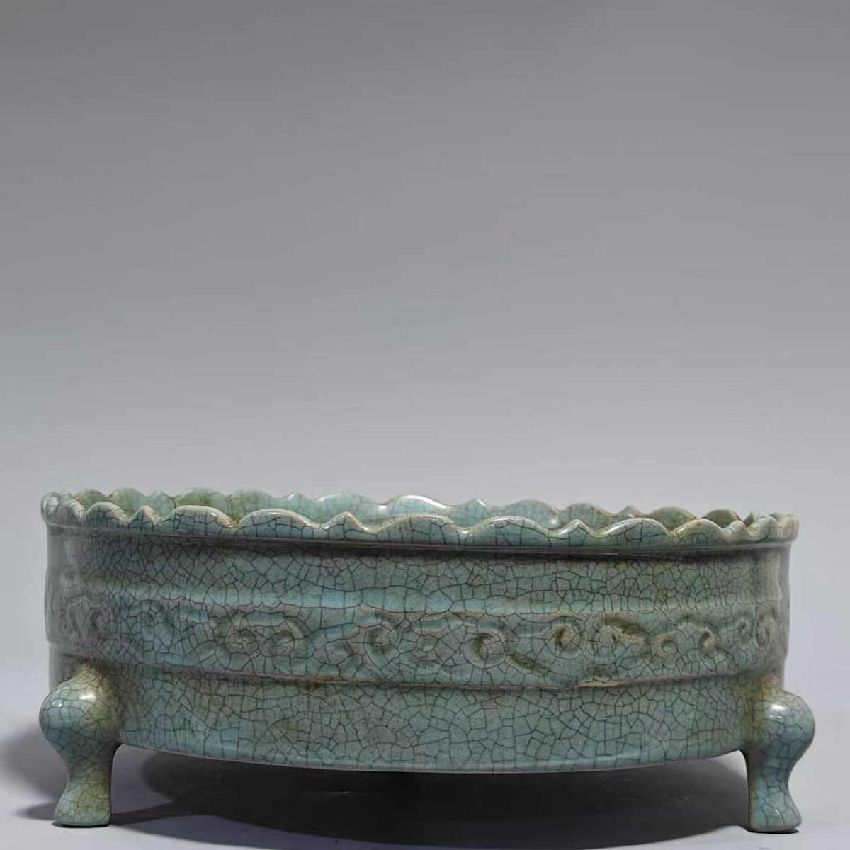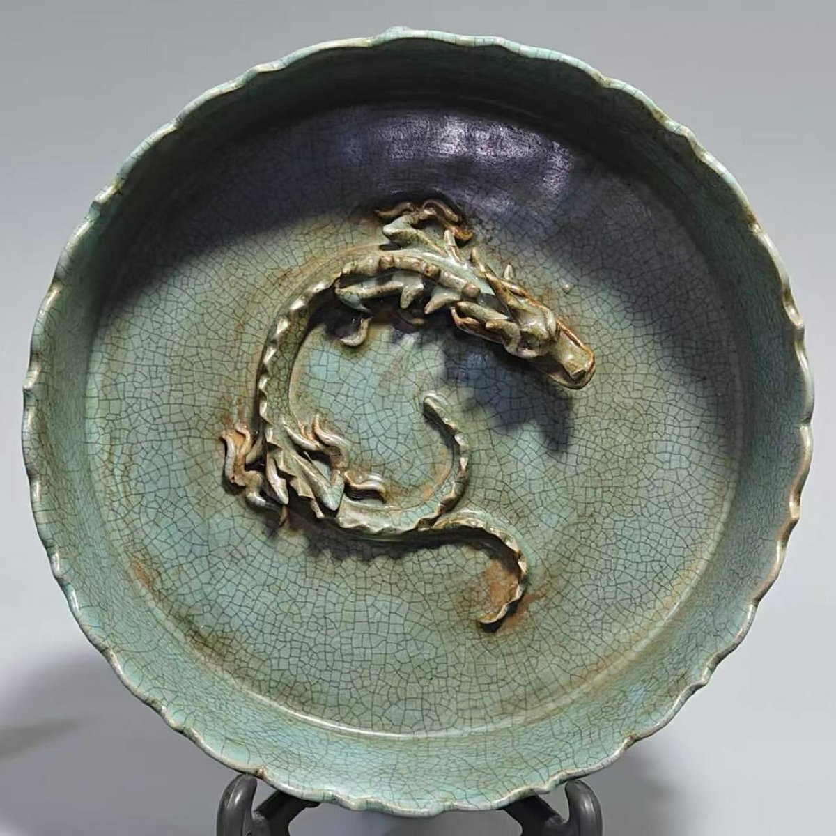 J2314 旧家収蔵 【宋官窯汝磁器堆塑竜紋果盤】 置物