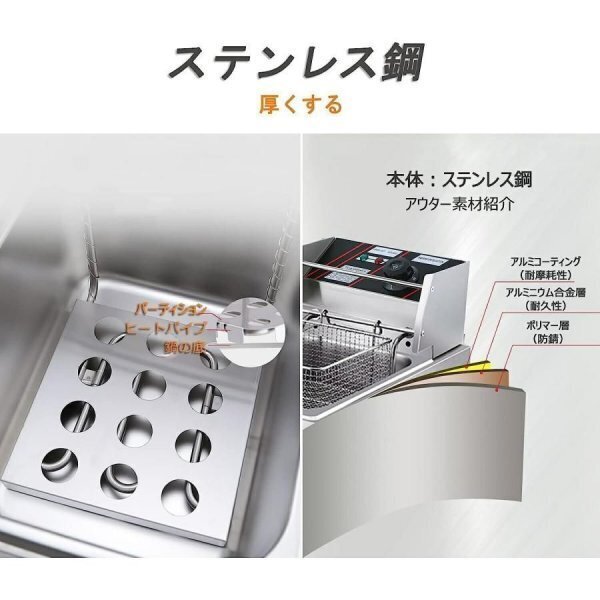 【厚いステンレス鋼】 進化版厚めのステンレス鋼で、外層に3層の合金メッキが施されています。その目的は、フライヤーを耐摩耗性と防錆性にすることです。