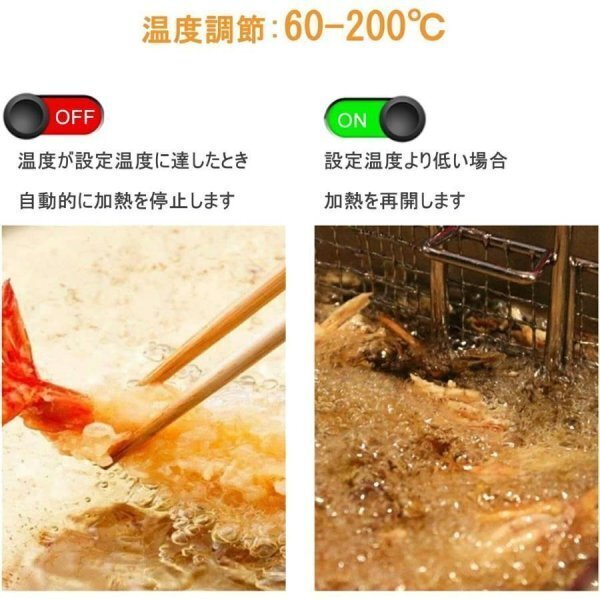 【急速加熱】 1700W発熱体を備えたこの電気フライヤー装置は、2分間の急速加熱、熱がオイルタンクを取り囲み、油温が食品の栄養素を固定し、サクサクした味わい。