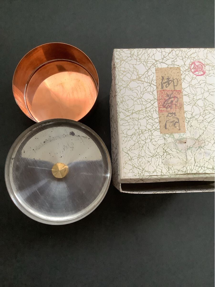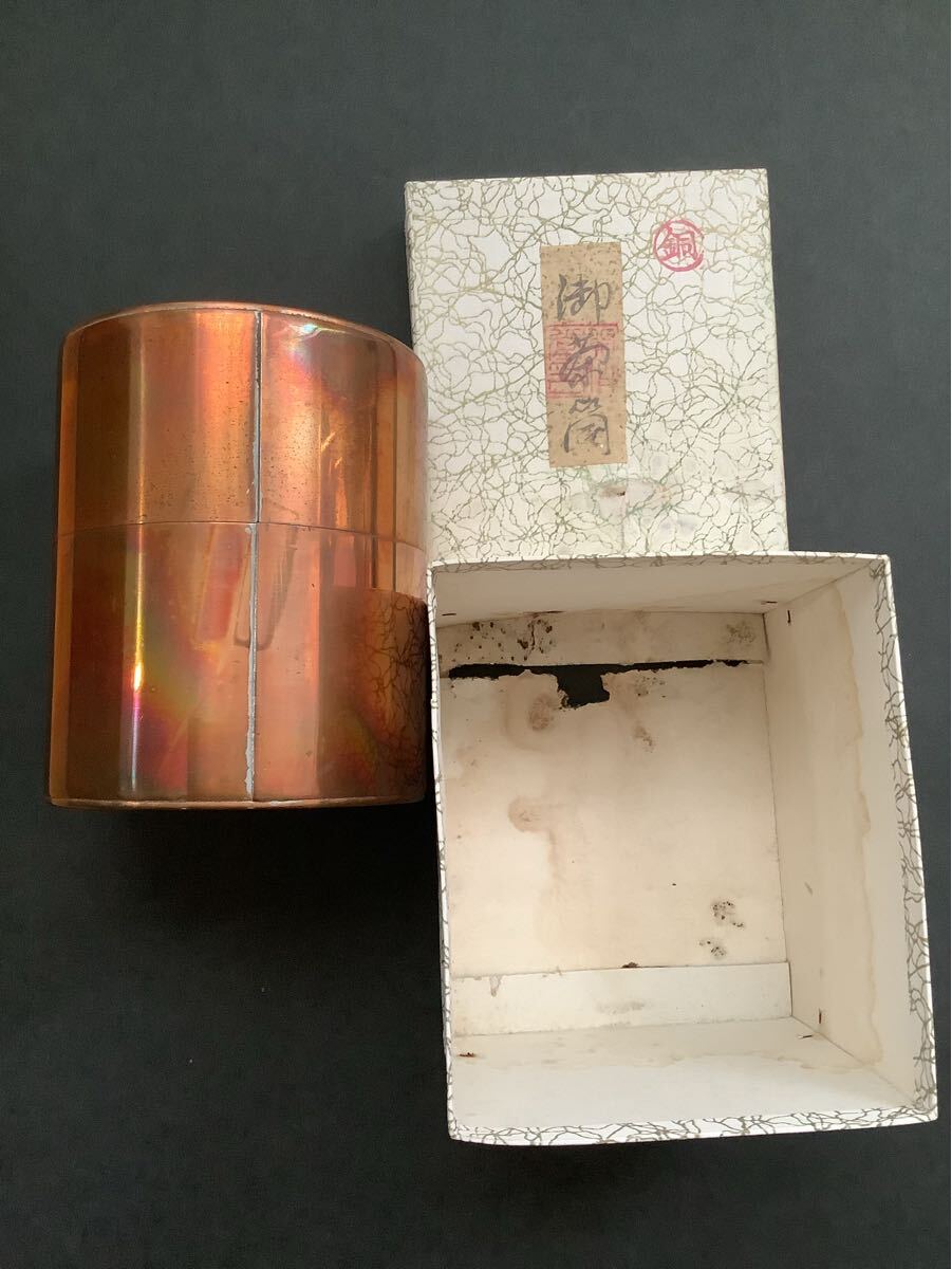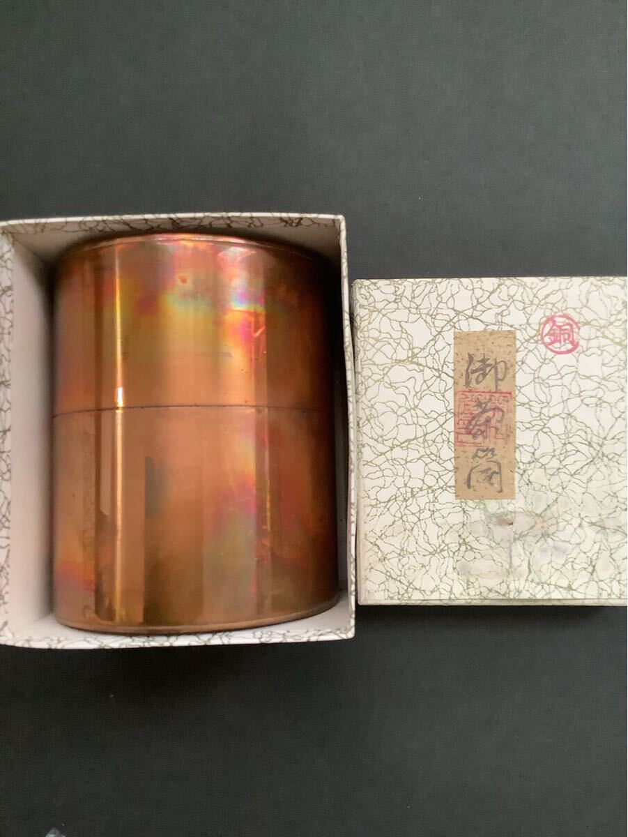 開花堂の銅製茶筒です。約40年前の物で開封しましたが未使用です。
