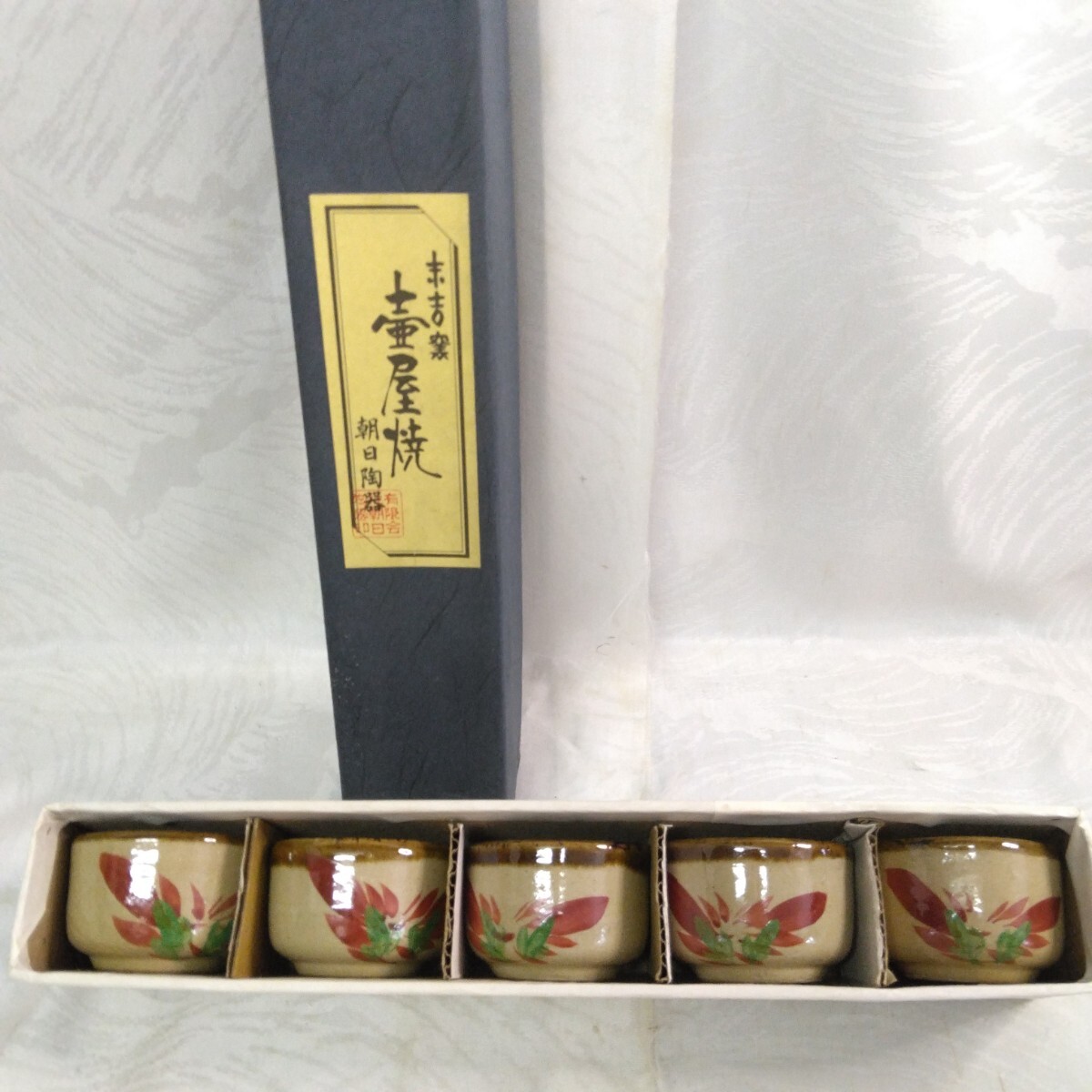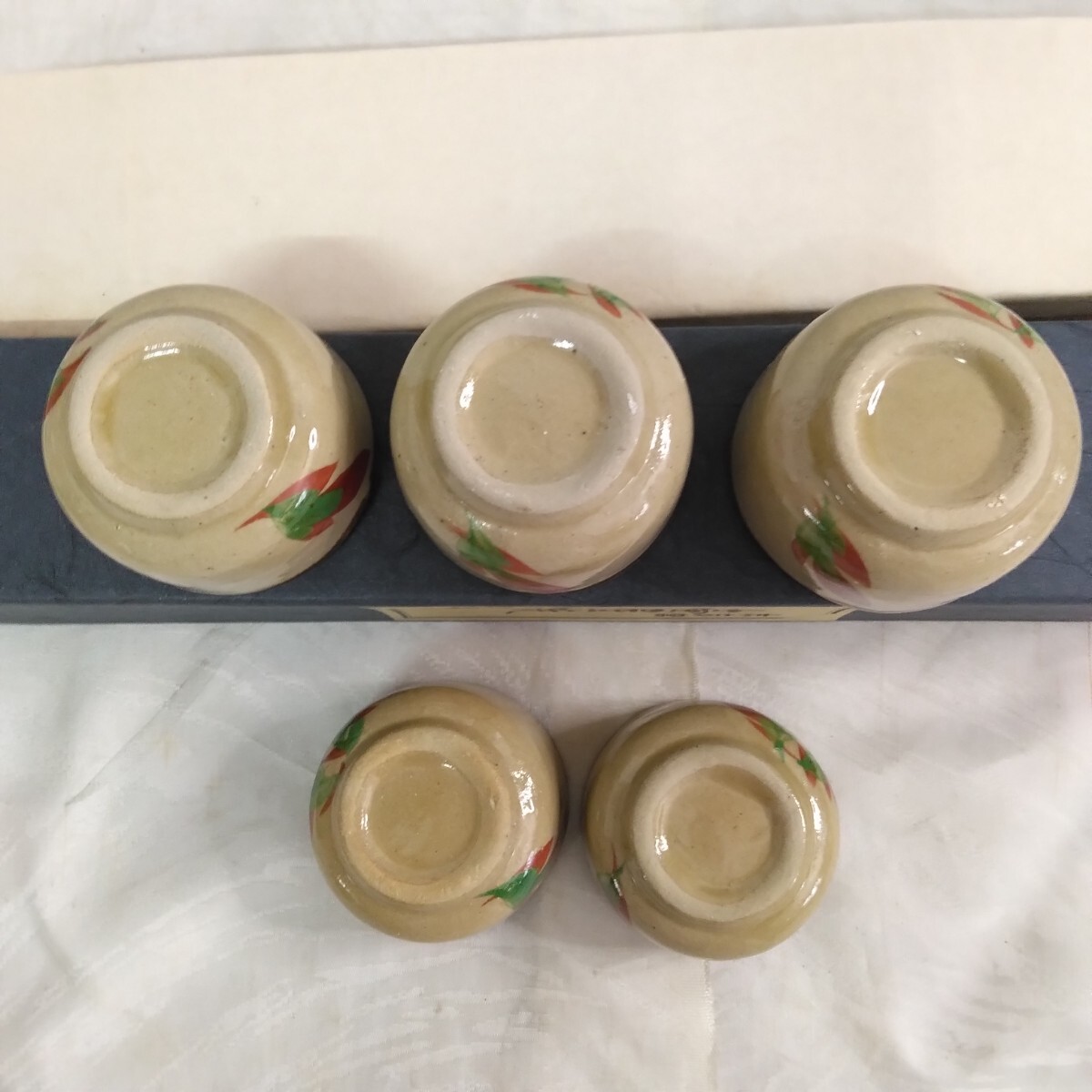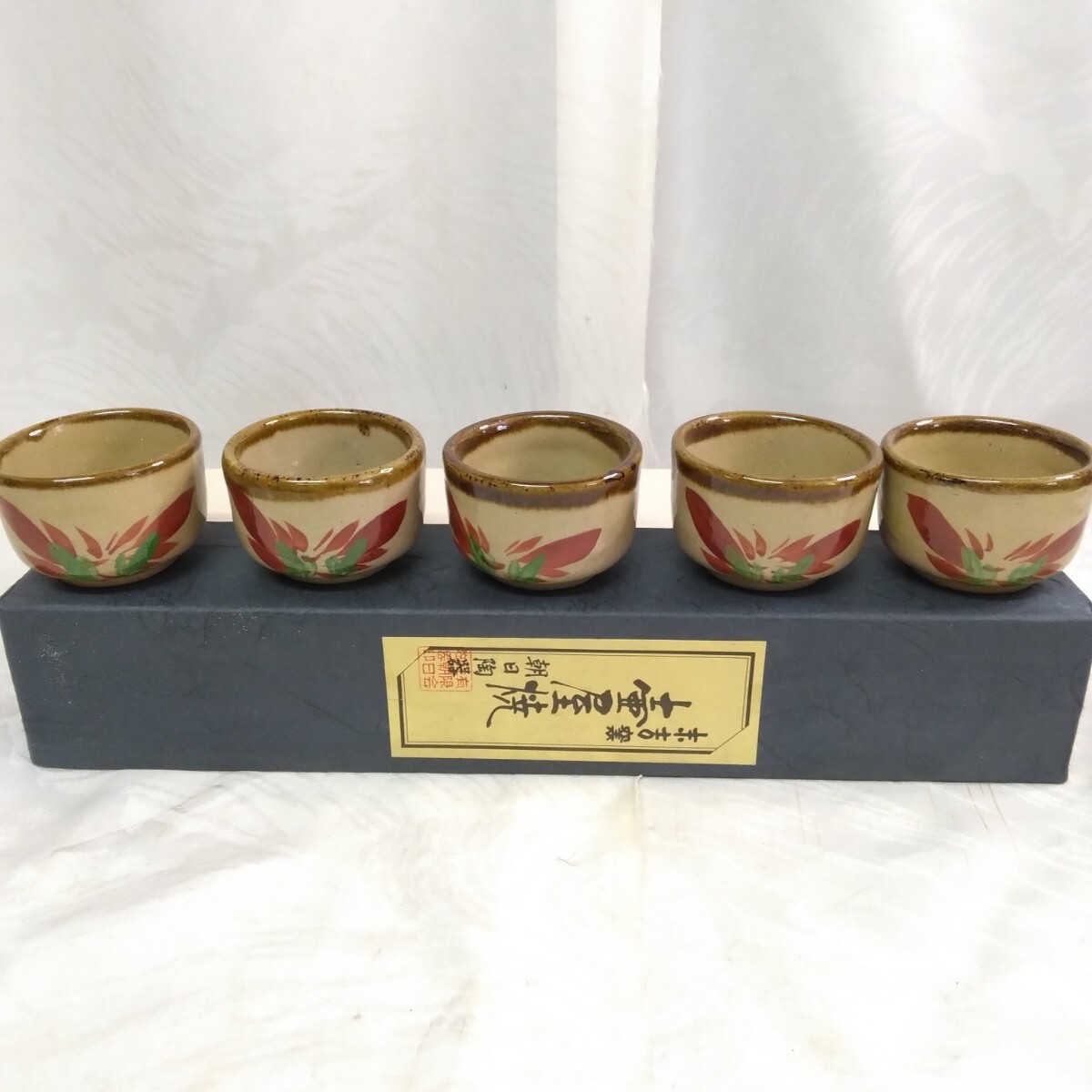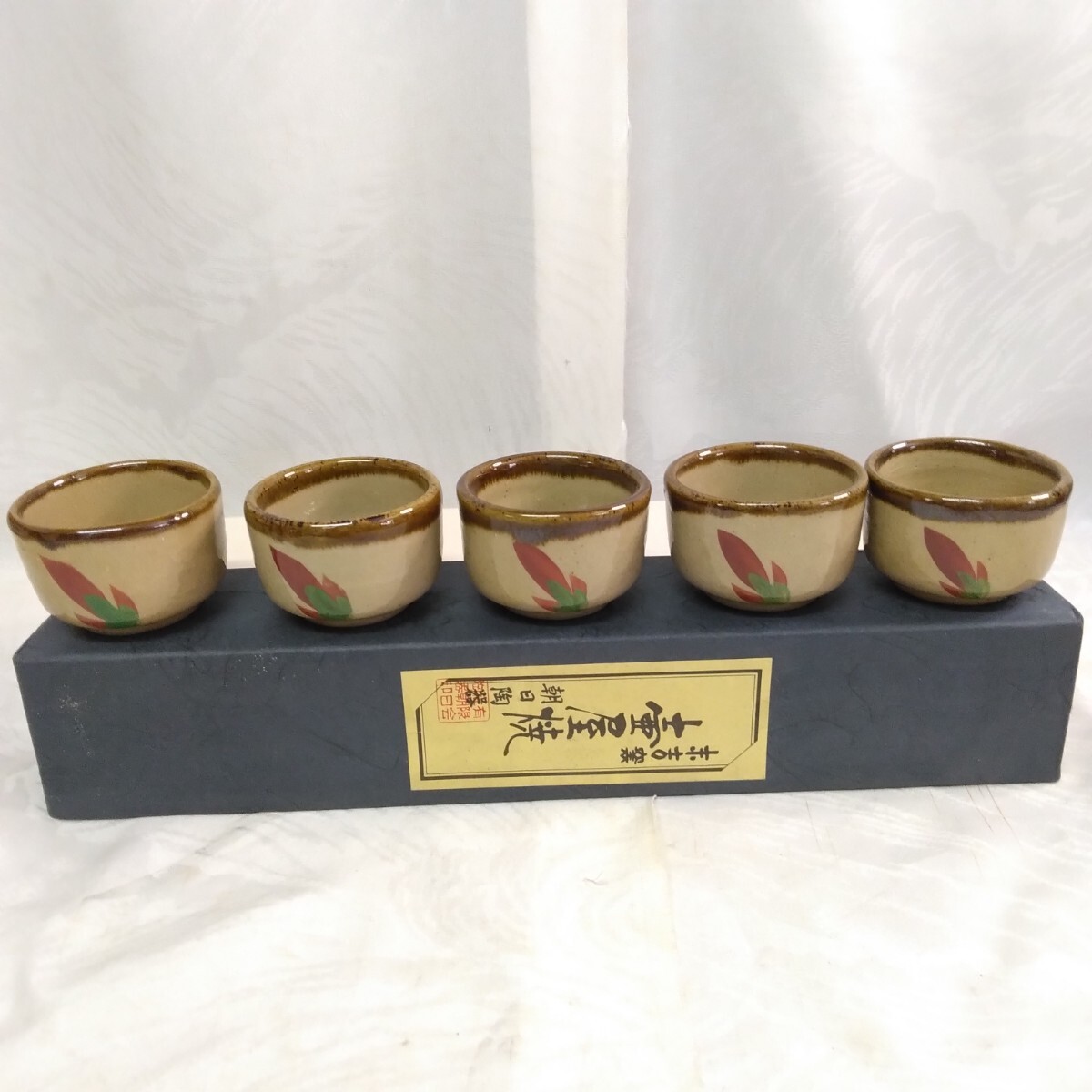 【末吉窯】ぐい呑み 5客 おちょこ 壷屋焼 酒器 朝日陶器 赤絵風 食器 箱付