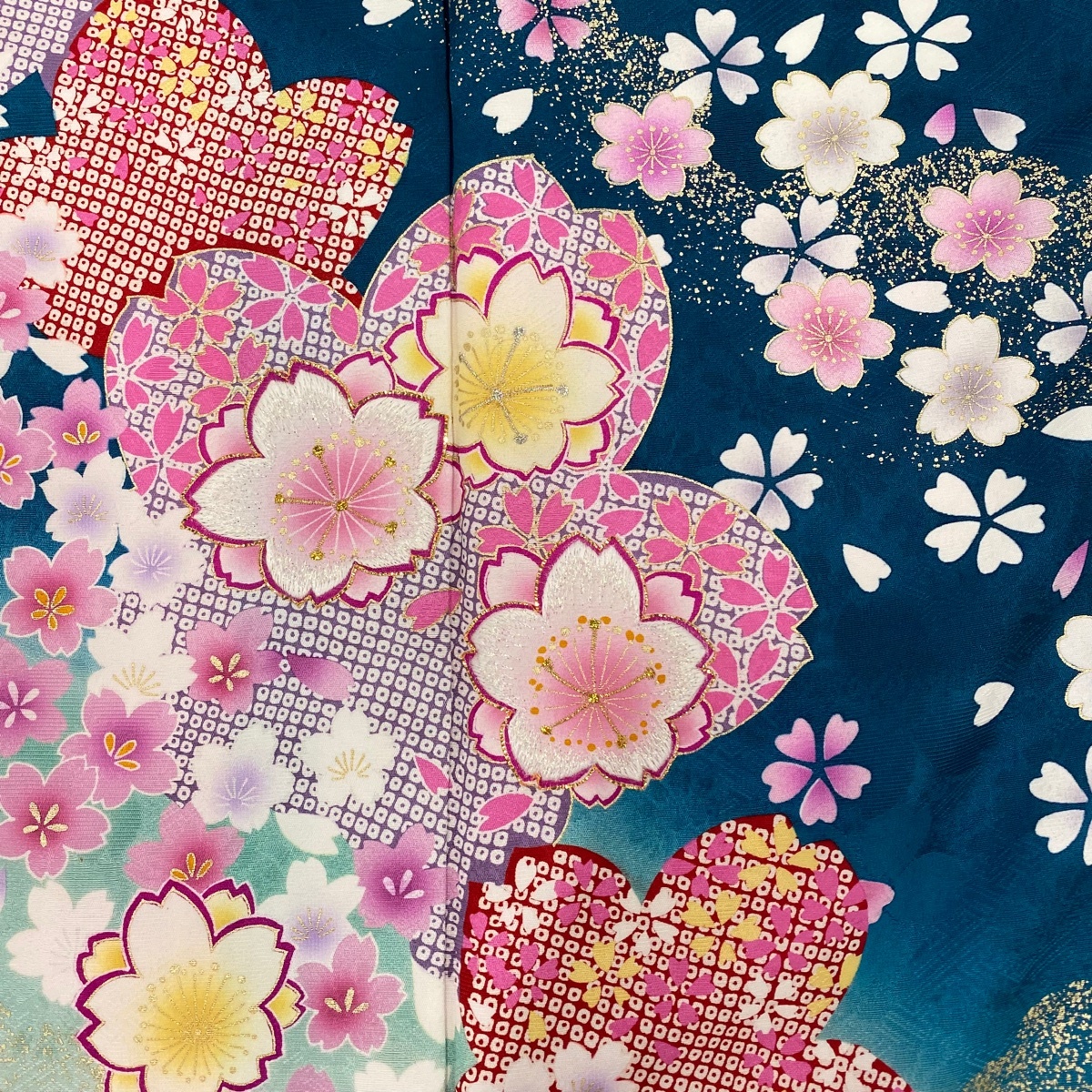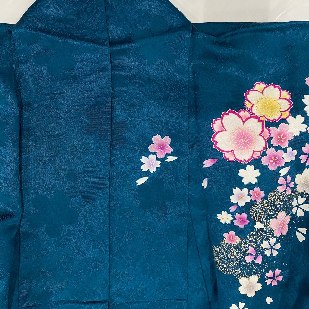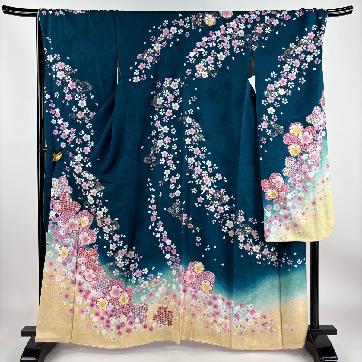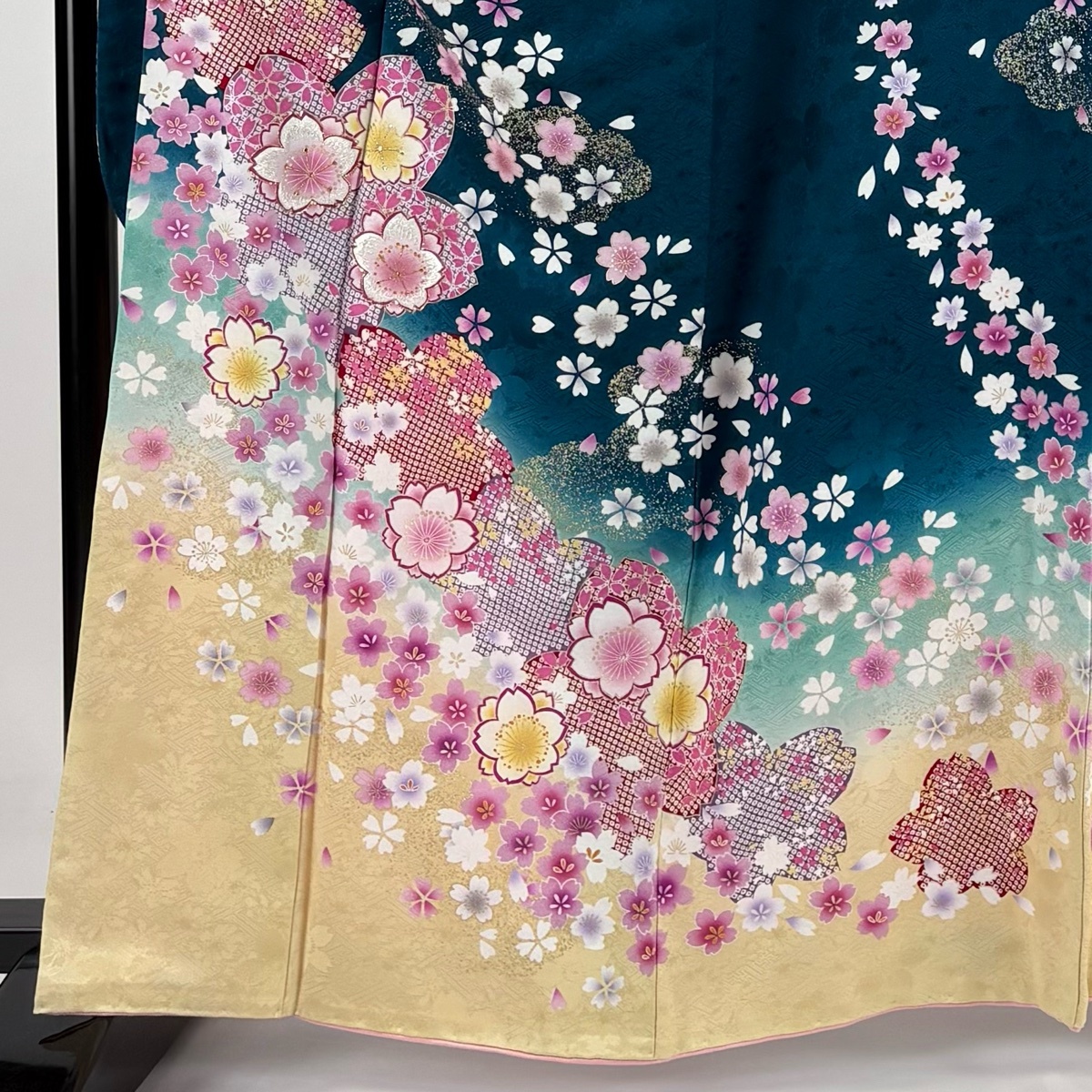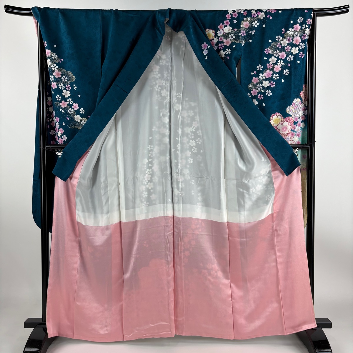 | 振袖 美品 名品 桜 桜の花びら 箔 金彩 青緑 袷 身丈163 裄丈69.5 L 正絹 【中古】 |