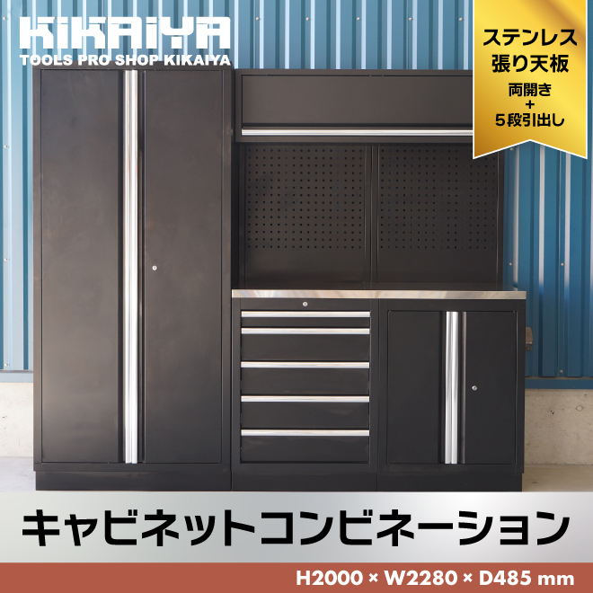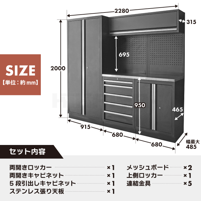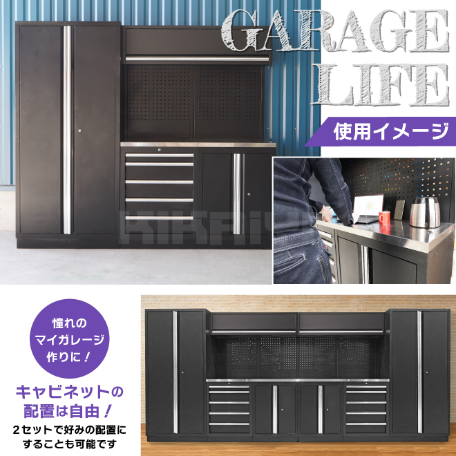 ●キャビネット、ロッカー、メッシュボードなどの大容量壁面収納セット ●黒色×ステンレスでガレージや事務所などをクールで清潔感のある空間に演出します ●木材の天板にはステンレスの薄板を被せており、丈夫で傷つきにくくなっております ●両開きロッカー、キャビネットの扉は約100度開きます 扉の上下にマグネットキャッチ付き ●両開きロッカー、キャビネットはそれぞれ可動式の棚板があります 両開きキャビネット内の棚板(1枚)は4段階でスペース区切り調整ができます 両開きロッカーの4枚の棚板は8段階(160mm間隔)の調整ができます ●5段引出しキャビネットは全段ベアリングレールを使用 ウレタンマットを敷いており、傷を防ぎます ●鍵付き(スペアキーあり)で両開きロッカー、キャビネットの扉や引出し全段をロックすることも可能です ●上側ロッカーは、ガスダンパーでスムーズに開閉できます ●使い勝手のいいメッシュボードは、マグネット等で工具や文具を収納することができます ●両開きロッカーやキャビネットの配置は、自由に変更できます ●KIKAIYAロゴステッカー付き |